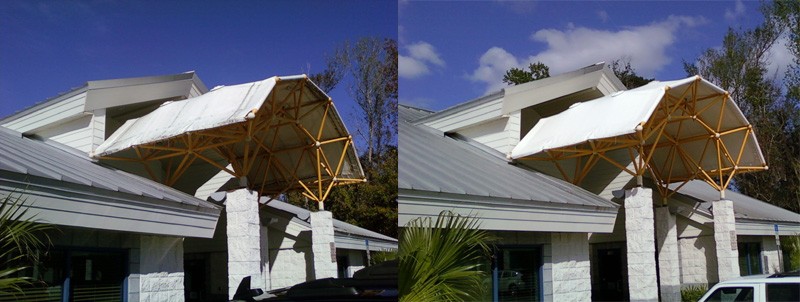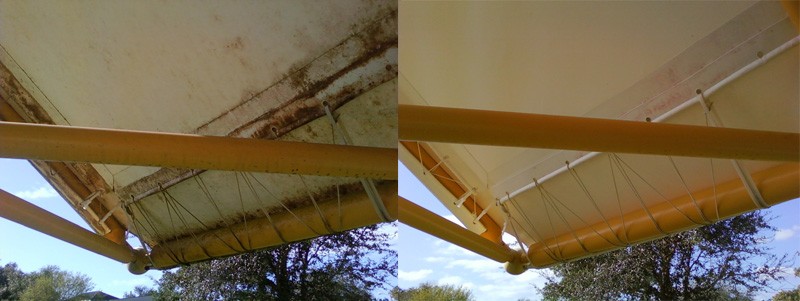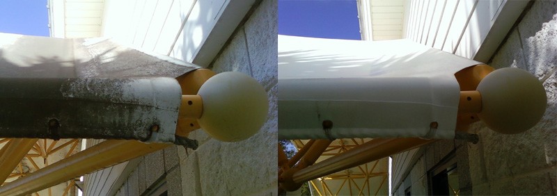 The roof above will still need rinsed because the gold dead algae will stain the awnings as it drips off the roof. Clean the roof, clean the awnings ten rinse it all down. The customer will love how the chems brighten the awnings. You can also buy chems for restoring the water resistance to the awning fabric and offer that as an up sell. We have done thousands of awnings and fabric roofs. TerraClean did the Cirq De Sole building at Downtown Disney for years. The OcOnell Center at UF, Awnings on restaurants, Disney's Yhat & Beach Resort whitch had striped red and white awnings and many more. Color usually doesnt matter just stay away from marine canvas. That uses non colorfast dyes and cotton thread witch the bleach will destroy.