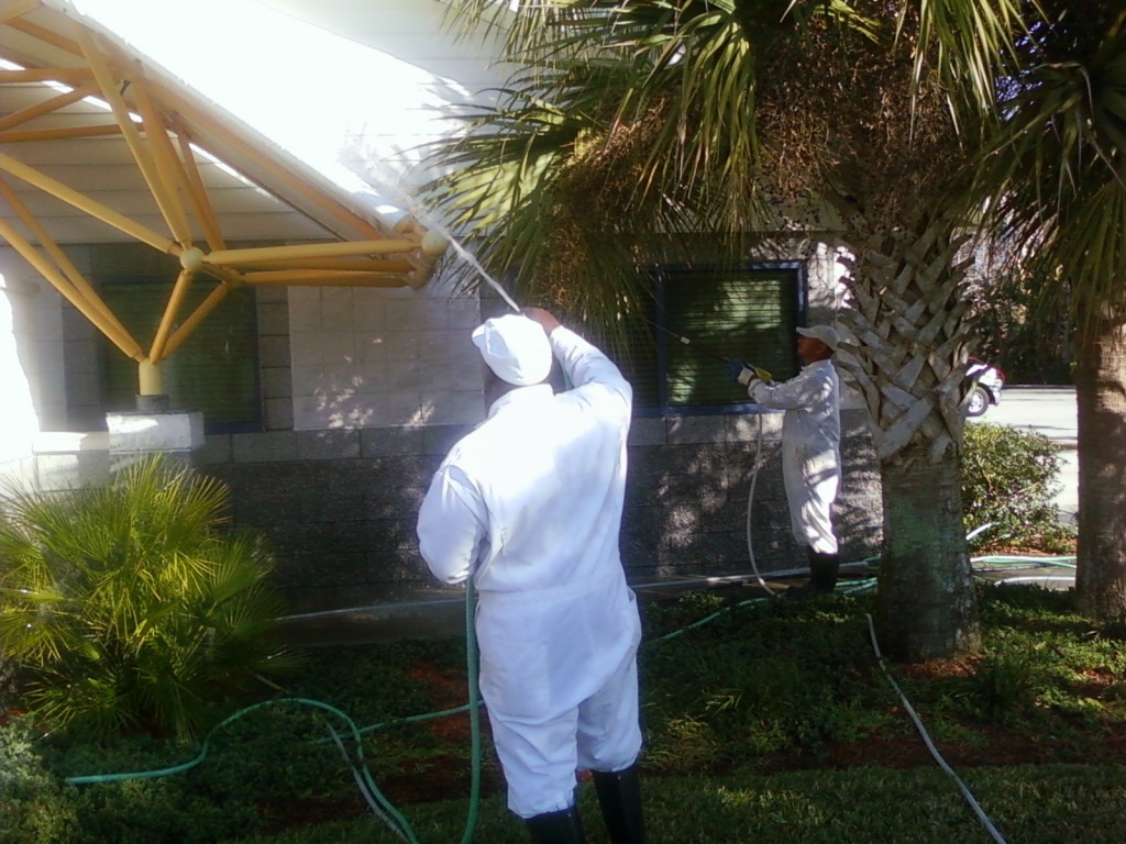 You COULD rely on wetting them thoroughly, but I would cover them with thick plastic. I would also completely rinse the roof above them so that the residual doesnt drip on them afterwards with a light rain or dew.
