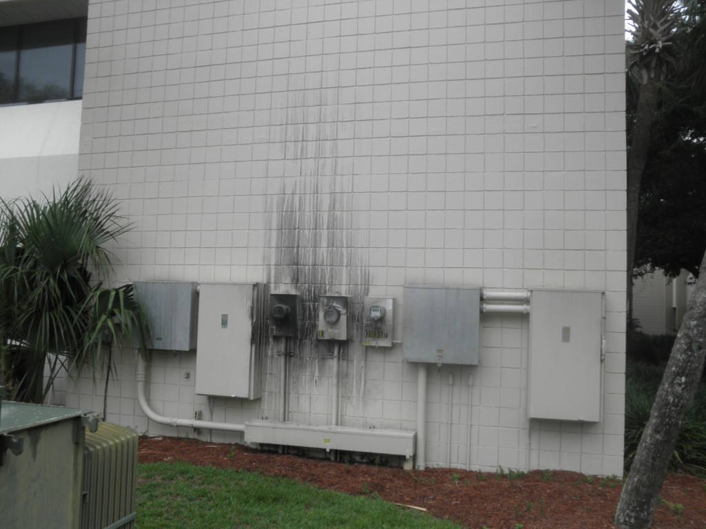 Funny you should mention this idea. My worst screw up happened just yesterday, June 25, 2011. I was softwashing this building, aiming at the top of the second floor. I had just begun on this wall. Suddenly I heard a BOOM right in front of me and was hurled to the ground. Somehow water had gotten into the meter and caused a short. It literally exploded into a ball of shrapnel, fire and electricity. If I had been a few feet closer to the box, or spraying chemical directly on to it, I would have either died or been seriously injured.