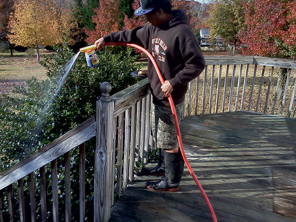 The mix was 1.5 gal. of SH 32oz of GREEN WASH, and topped 60 gal. tank w/water. The mix was allowed to dwell for 3-5 min. and was rinsed off with just a 3/4" water hose w/ a sweeper nozzle.