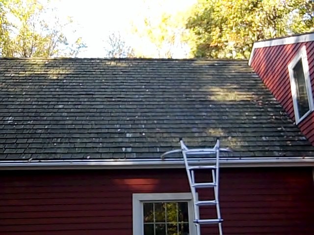 This is a cedar roof on a garage. It is about 18 yr’s old. I used a 2% mix and sprayed it twice. Once one day then I went back two days later and sprayed it the second time. The reason I did this as AC stated in one of his posts, that cedar is soft wood and you don’t want to over bleach it. It looks better in person but I took pictures anyway.