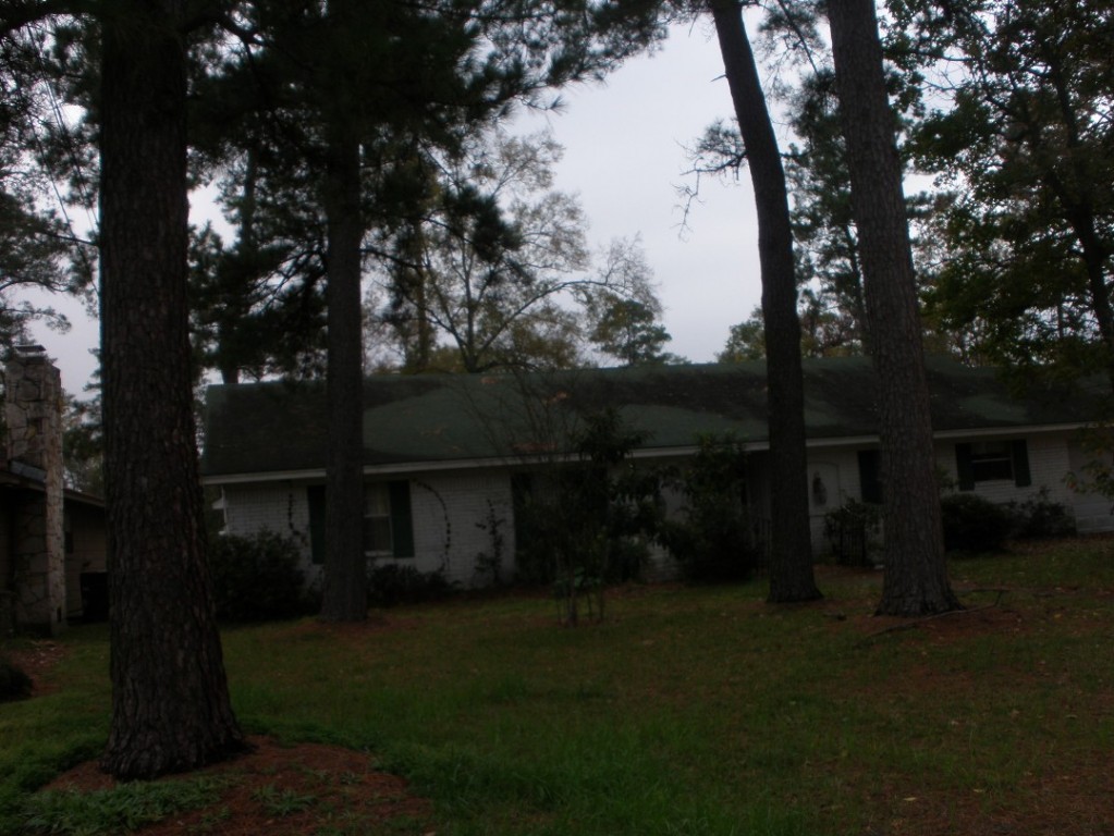 Here is my guess... That roof had a very thick mat of pine straw/debris on it which was recently removed. The GM did not grow under the pine straw. I have seen this on a few rehab properties I have cleaned in the past with neglected roofs. That roof is pretty low pitched and the pine straw would just sit up there if not cleaned off regularly. Sometimes you'll notice this to a lesser concept on roof valleys that are packed with leaves, the singles are clean under the debris.