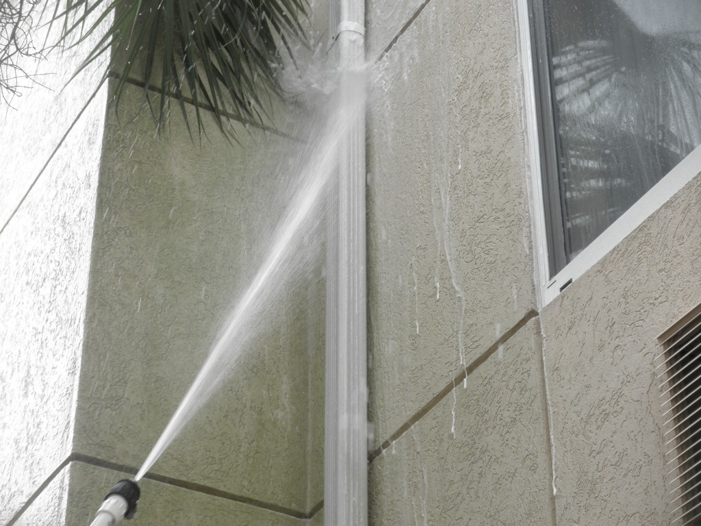 Spray Wash Exterior Cleaning has just completed another large hotel cleaning project. This project took 10 hours with a three man crew (me included). The Dryvit exterior of this hotel is especially easy to damage with harsh pressure washing, so a gentle soft wash by SWEC was the perfect solution for getting rid of these dirty algae stains and restoring the original brilliance of the exterior finish!