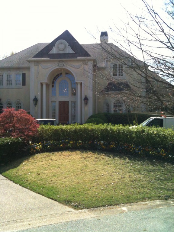I bid and won this job. It is a roof clean, house wash and gutter clean. Not so excited about the gutter clean. Now that I got the job, How the heck do I get up there? In the third picture you can see how far out the Azaleas extend from the house. No Way a ladder will reach without extreme angle. I have priced in a 37' trailer mounted boom lift. Let me say this is a BIG house. 8,000+ sqft.