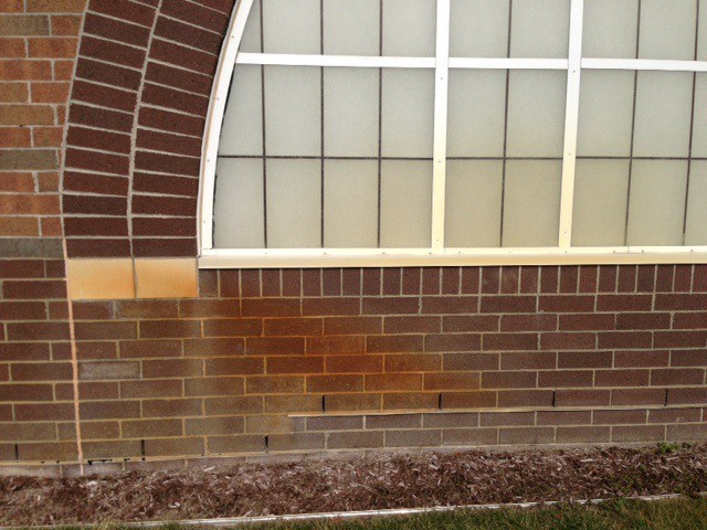 I sprayed F9 rust remover on a high school to remove the irrigation stains. The stain was removed. But when I returned to take the after photos, the brick had a white haze to it. I called Craig at F9 he told me to go back and rinse the area and lightly scrub the area and rinse again. The white haze seem to get brighter as you can see from the after photo.
