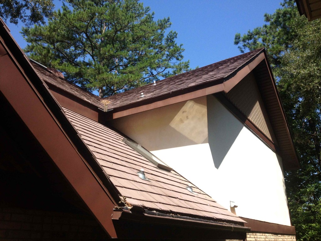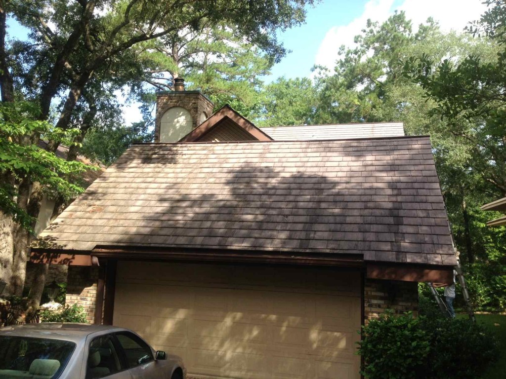 A couple of unique challenges were immediatley evident with this home. The severe pitch would be difficult to walk on a asphalt shingled roof, but when covered with 1/8 - 1/4 thick inch brittle concrete shingles it becomes impossible to access by foot. Signs of chipping/breakage were pretty evident on the roof just from limbs dropping, and previous ladder access so I could only imagine how much damage a person could cause