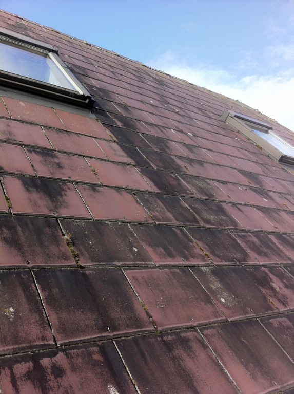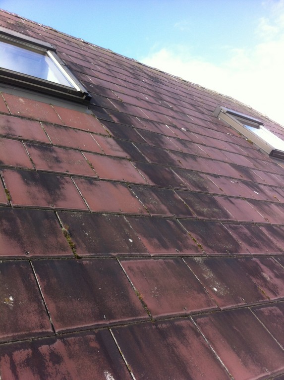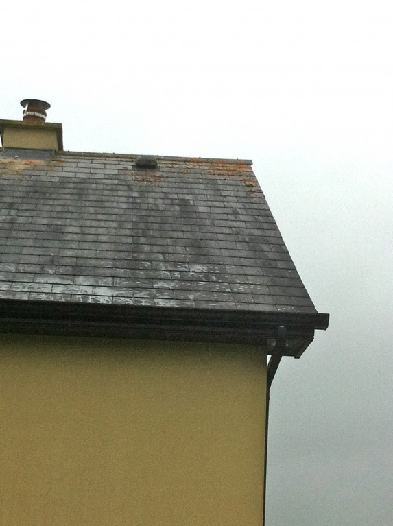 you probably will remember these photos from a few days ago. I washed a black synthetic slate roof yesterday and uses a mix based on the apple mix but the results were poor. I expected the black fungus to disolve but was disapointed with the results. To be honest I didn't add enough tsp or borax to the mix but would that much of a difference. I was able to remove a lot of the fungus by using the pressure washer lightly. One thing I noticed was white spots where I cleaned. This was a result of the surface coating coming off the slate. I checked the roof of an adjoining garage which we had not sprayed and saw the white spots there only less noticeable because of the fungus. I think it is caused by acid rain or else the fungus, what do you think?