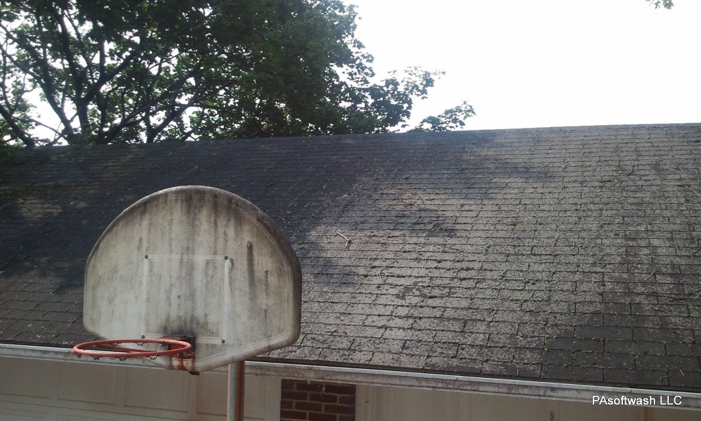 This garage was completely covered in you name it! PAsoftwash treated and rinsed this garage roof to remove Gleocapsa Magma, Moss, Lichen and Fungus.