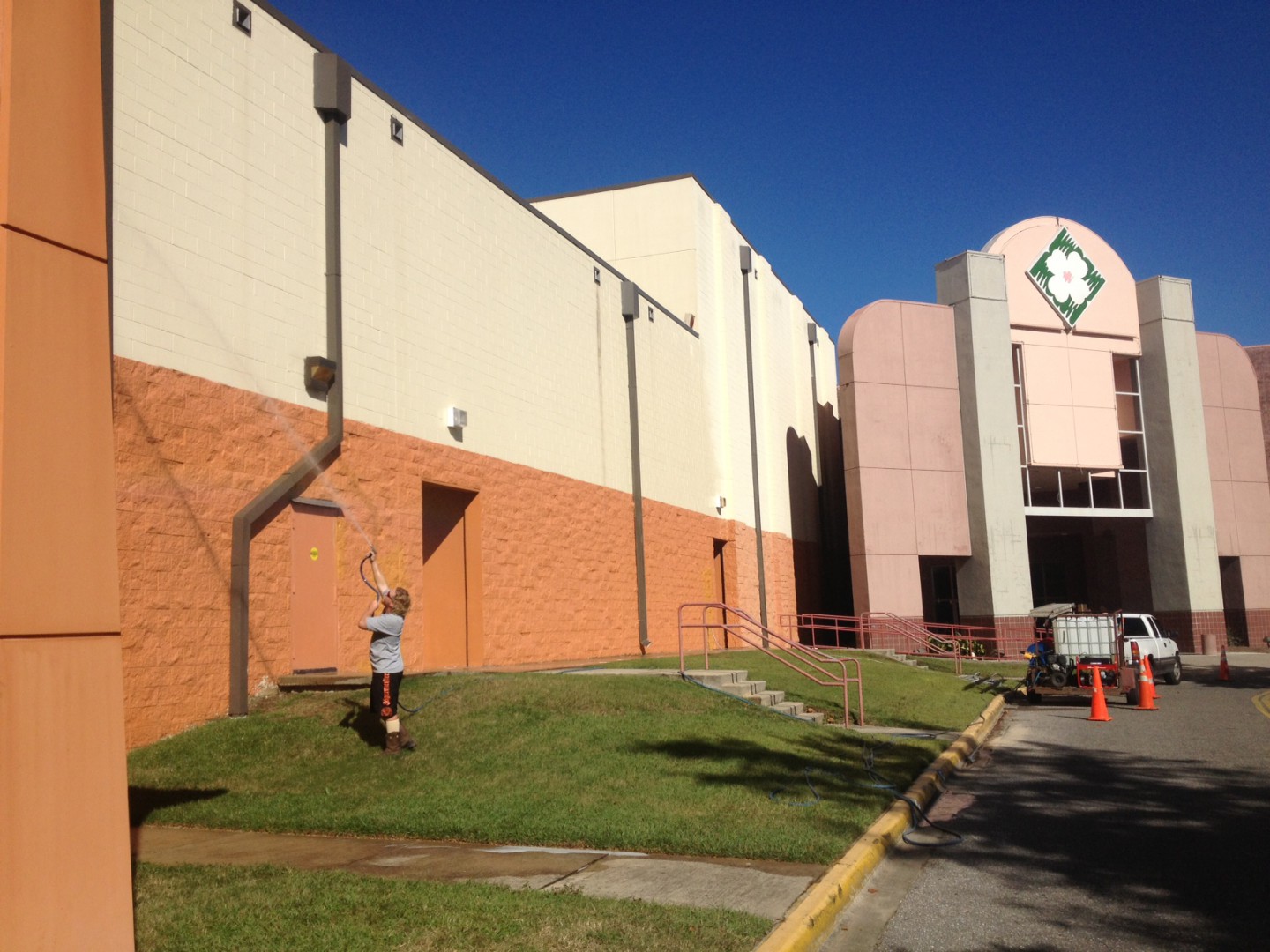 Spray Wash just wrapped up a cleaning today at the AMC 20 theater at the Tallahassee Mall. My crew of five (yours truly included) needed about 8 hours to complete this project. I had lots of extra hands on duty to provide traffic control.