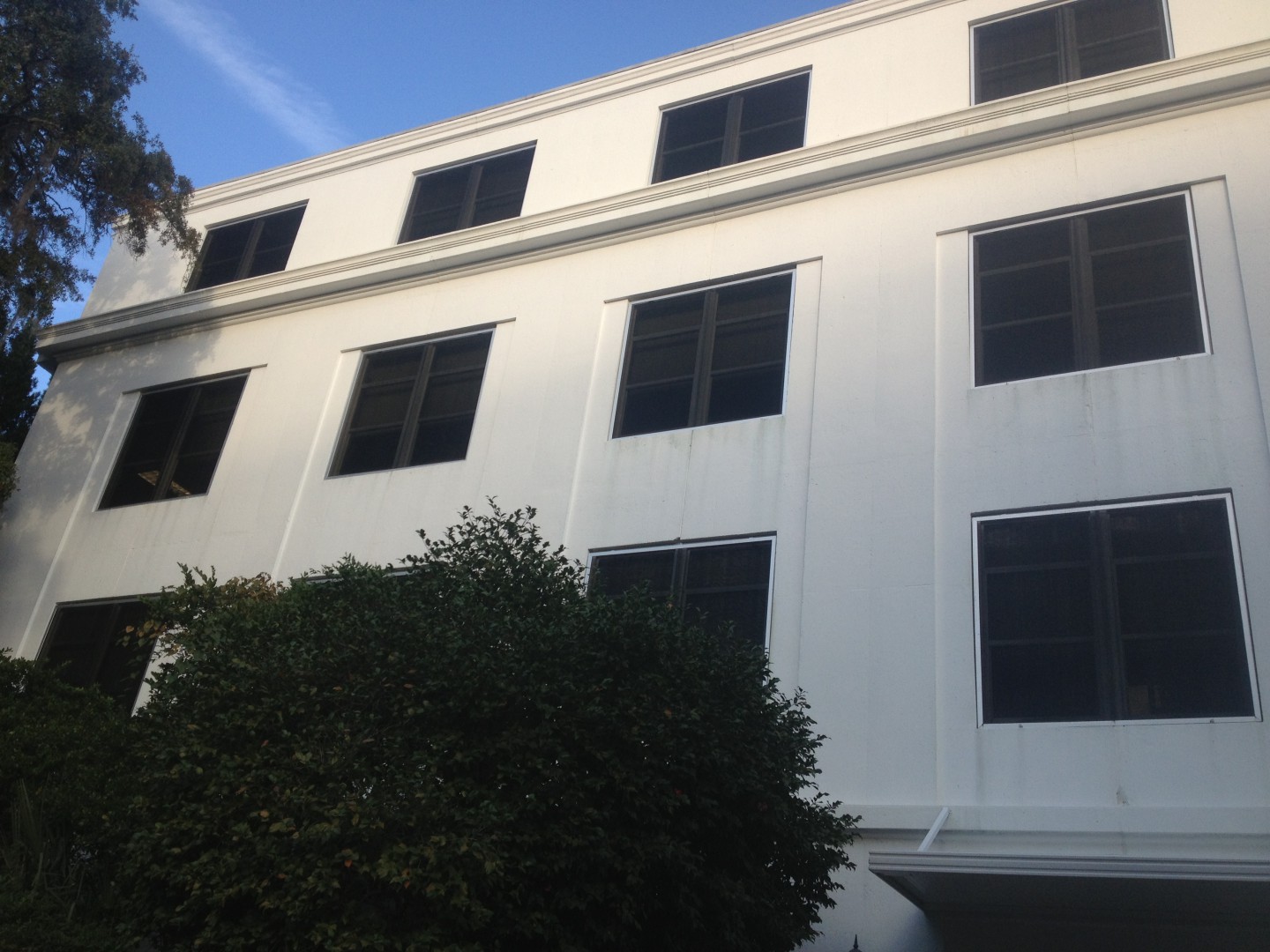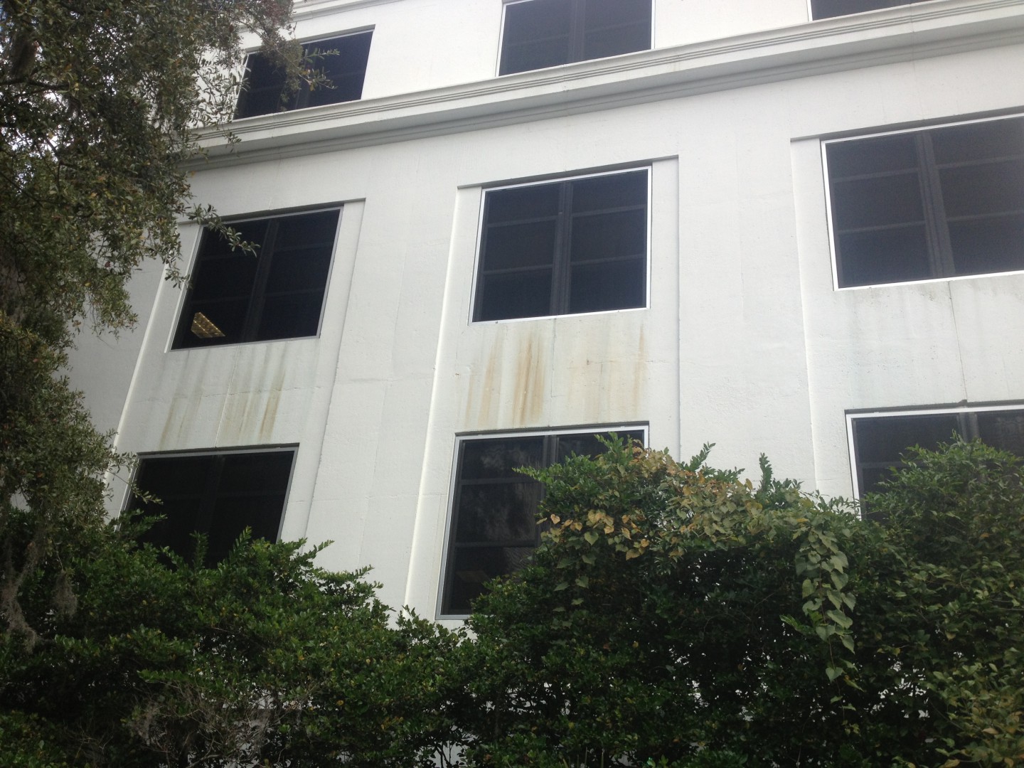 Stains under windows are not biological in nature, they have been caused by years of leaching from copper windows screens. Cleaning is a multi-stage process with a gentle softwash, rinse, then another application of a cleaner to remove these stians and a final rinse.
