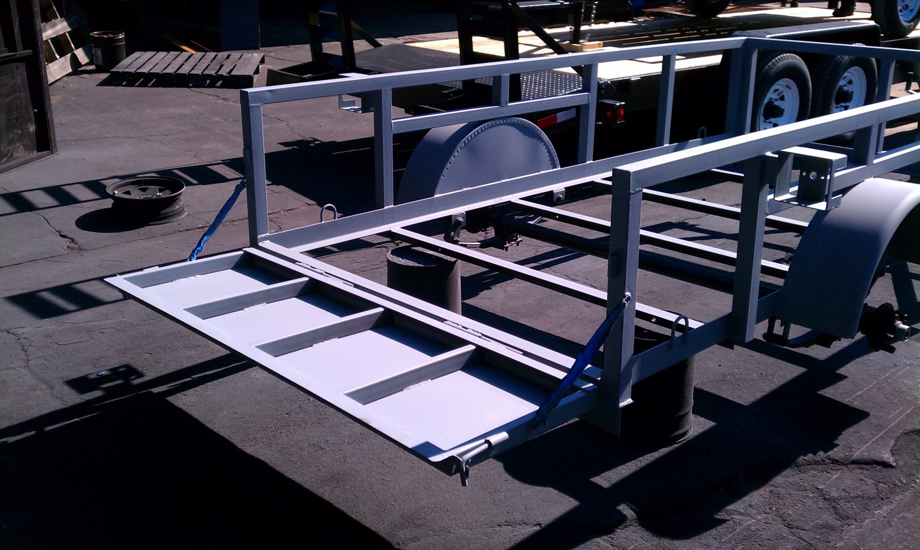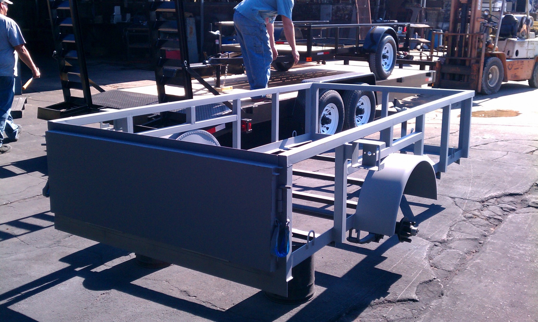 Pictures of the completed trailer. 5 x 10, 28" sides, full 2" tube throughout, tailgate style gate, aluminum rims, spare tire, 7 pin light jack, LED lights, flat sides for mounting signs. Can be picked up in Florida.