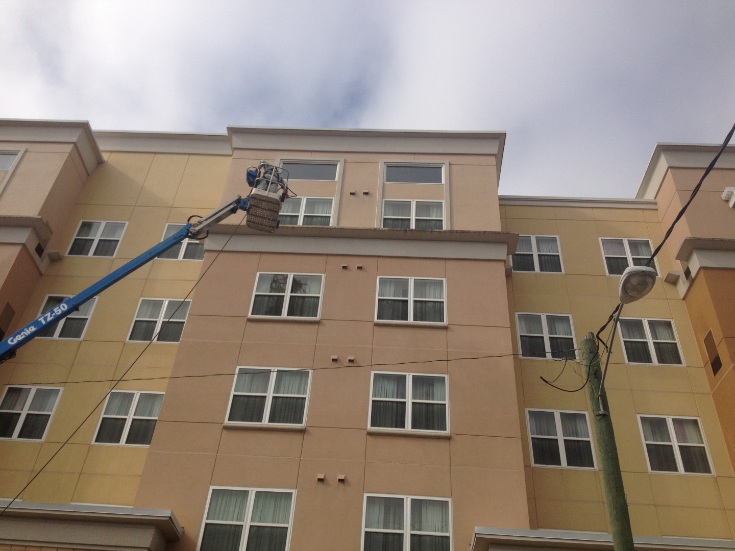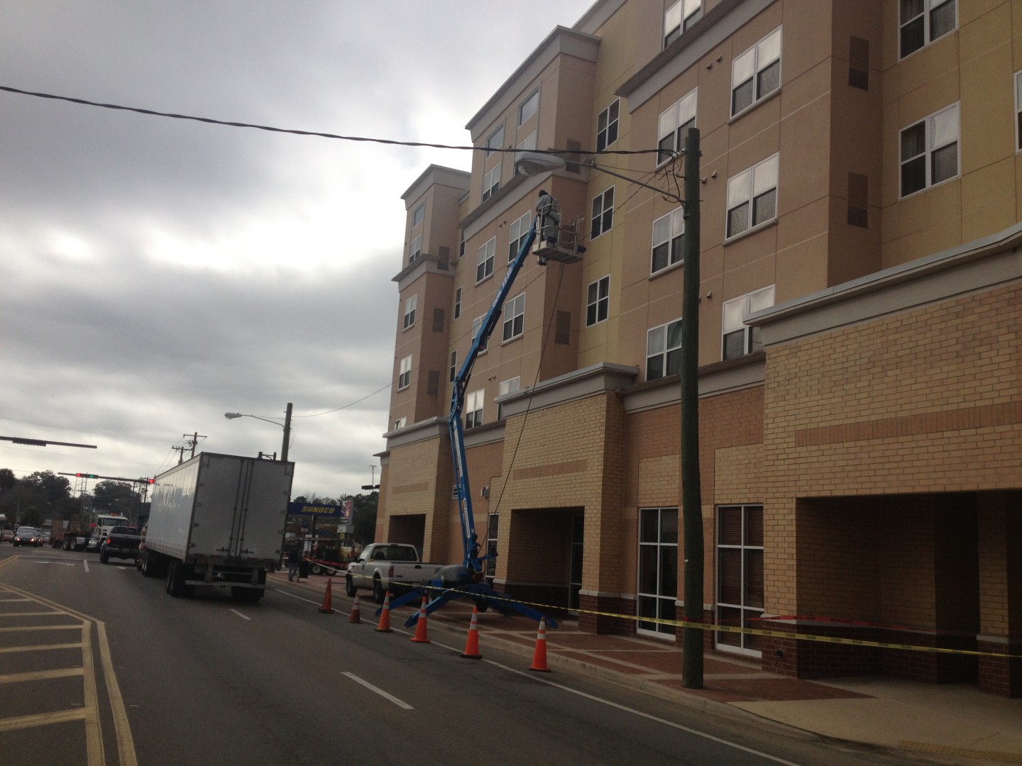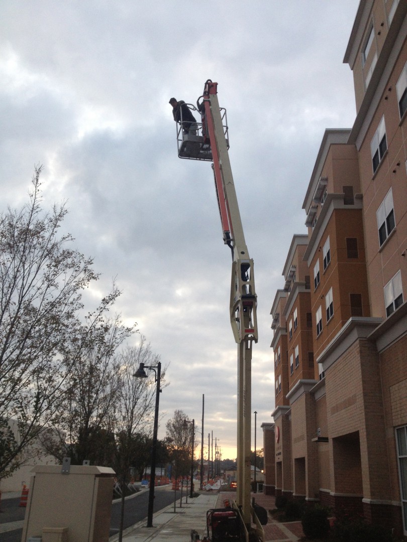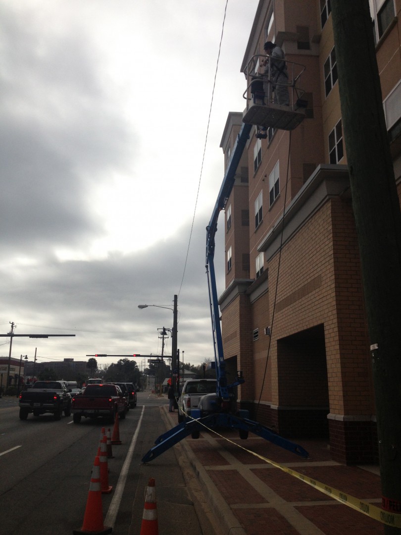 This is one of those jobs that brings everything tough into one pacakge. In one small area we have to contend with power lines, narrow & busy sidewalks, addtional business storefronts, a construction zone, a bus stop, lift work, and a hotel entrance that never closes. Not to mention this location is less thant two blocks from the FAMU and FSU campuses and school is now in session.