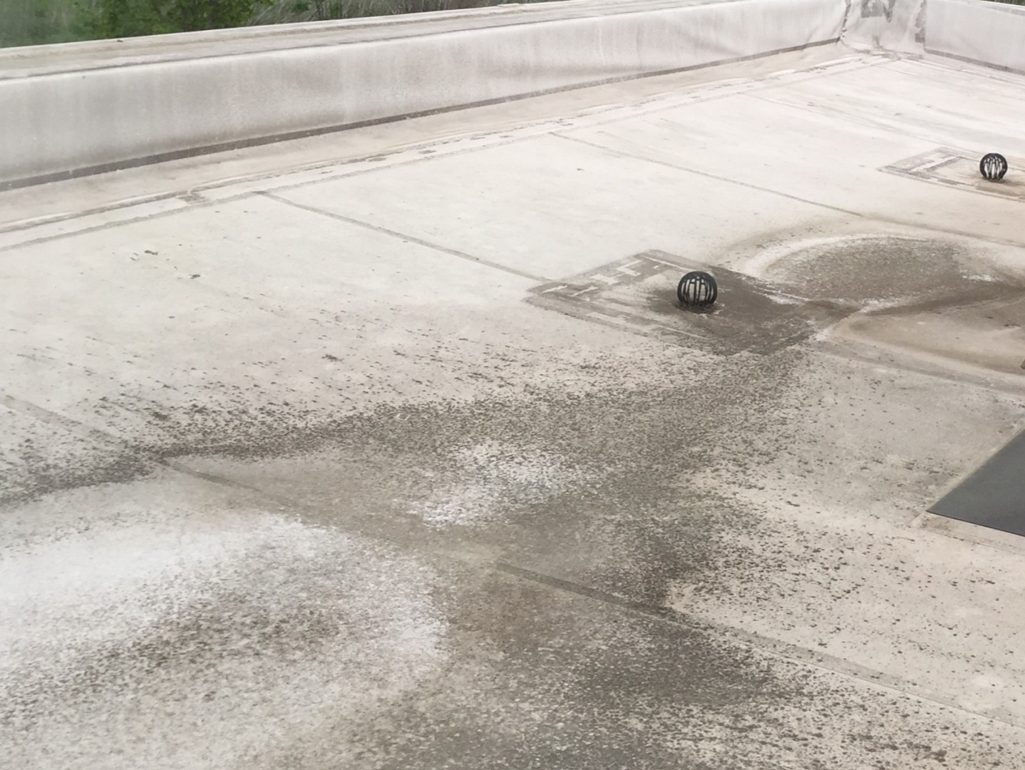 it might be Carlisle white EPDM, but it actually looks like Durolast PVC. Because the way the wall flashings are bagged and hung and those one way vents are specific to Durolast. Either way, you can use a 2% mix and some Terra Wash to clean this roof. It will most likely need some brushing too. The reason there are no gutters is because most commercial roofs have interior drains, which are in the picture as well. You will need to make sure the drains are clear and not clogged or else you will have a major ponding issue and also where these drains dump out. If they dump out into a parking lot or a retention basin is something you need to be clear on before starting. You might need to reroute or rinse something you had not considered in your bid.