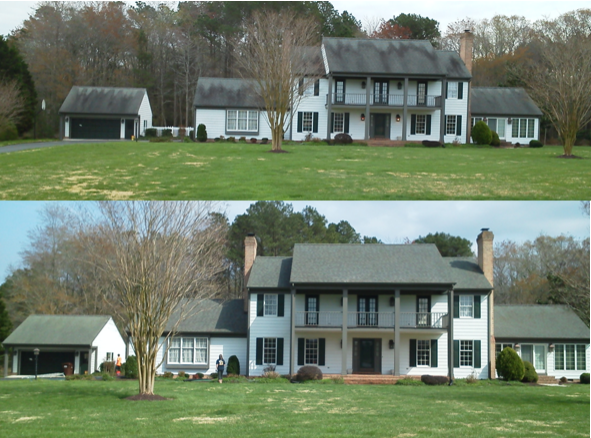 This beautiful home was located in Salisbury MD. Roof Cleaning was chosen due to the fact that they had already bought and installed zinc strips all around the house. You can see from the pictures that the zinc strips worked great, for the first foot and a half down the roof! Our low pressure washing allowed us to clean not only the roof but softwash the entire house, garage, decks, pool deck and vinly fences. To say the least the home-owners were excstatic!