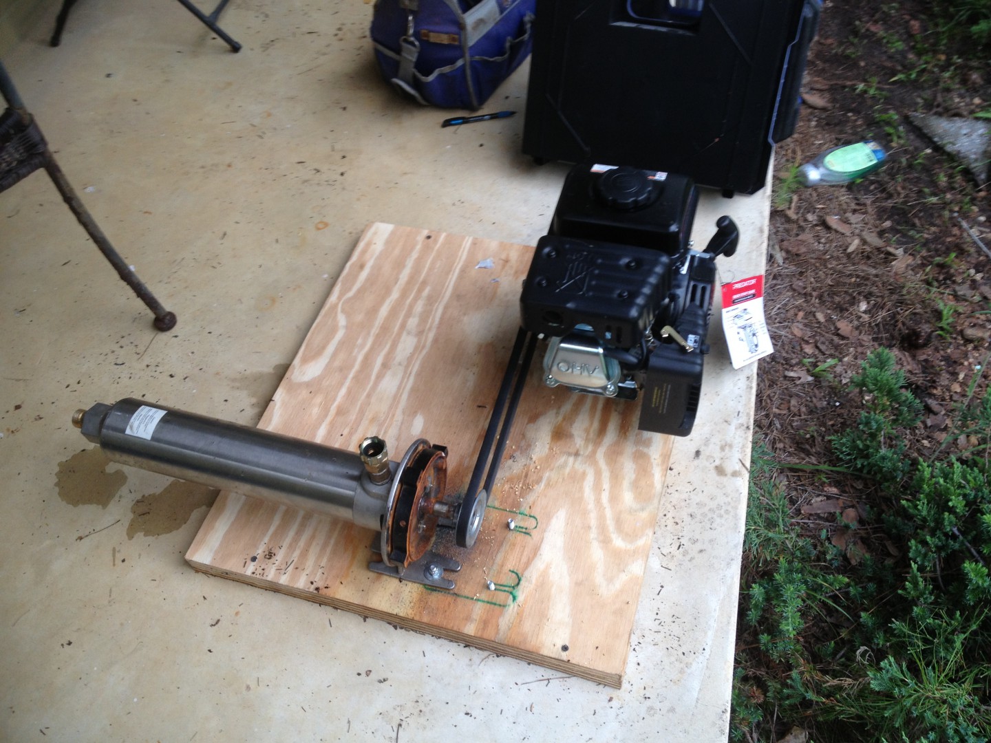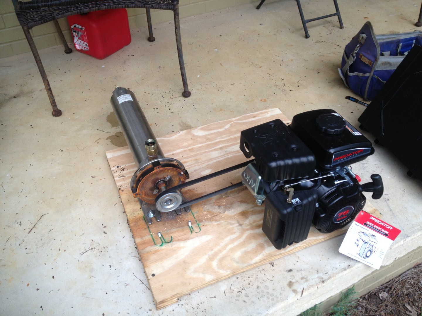 Ordered a dayton booster pump from Ebay a few months back (ok maybe a year ago). I reckon it got dropped during shipping, as the frame was a little bent, but didn't pay any attention to it. It sat in the garage and was going to be used as a back-up one day. Well, "one day" finally came, and the pump wound't work. Way too long ago to get money back from seller, file a claim, etc. Turns out the electric motor has gotten bent a smidge and ruined the motor, but pump head was still good. Started playing around a little bit and came up with this compromise for a spare rinse pump.