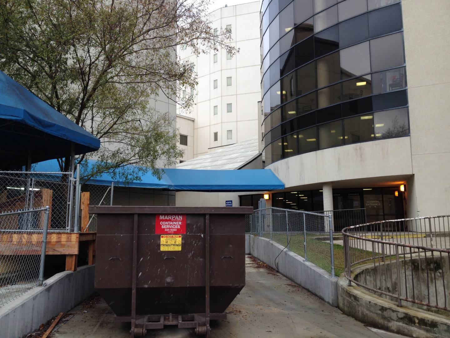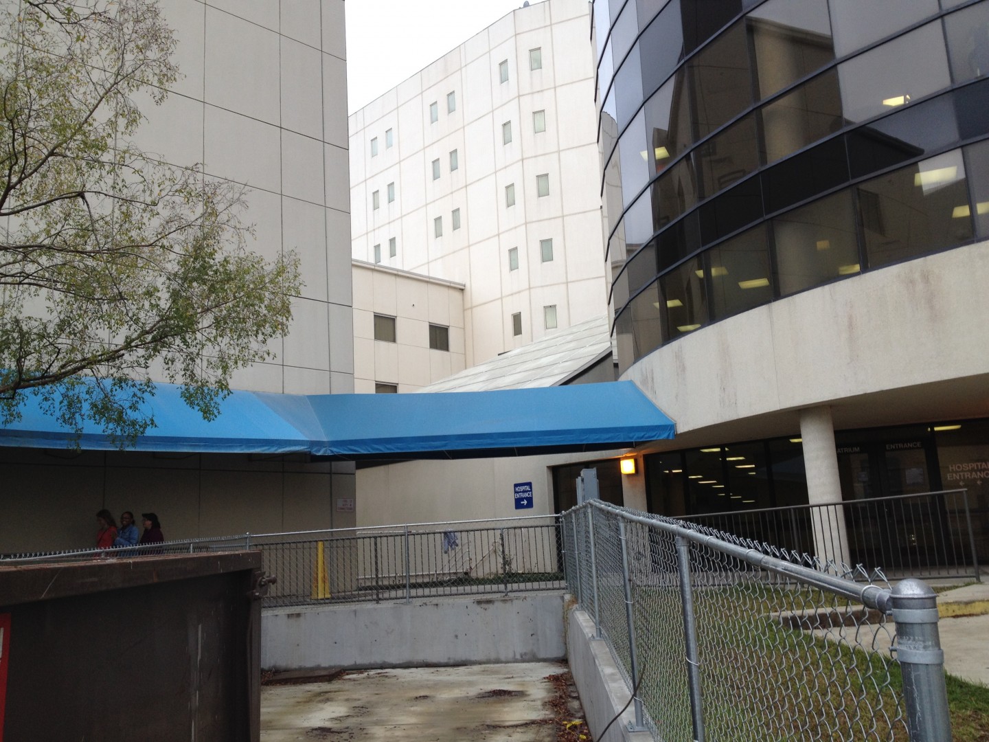 This a a small portion of one of our local hospitals. They are our largest customer. 9-10 months ago, when I originally bid this job, I had planned for either a crane or 120' lift to give me access to areas. I had not realized the infrastructure on the ground had changed so significantly. A driveway which we were going to use had been cut and 40' x 10 x 4 foot deep area had been excavated to accommodate a semi-truck/trailer mounted piece of medical equipment. This piece had just been moved when they ordered the cleaning. Additionally new awnings had been installed...all of this came together to make large lifts/crane unsuitable for use in that area.