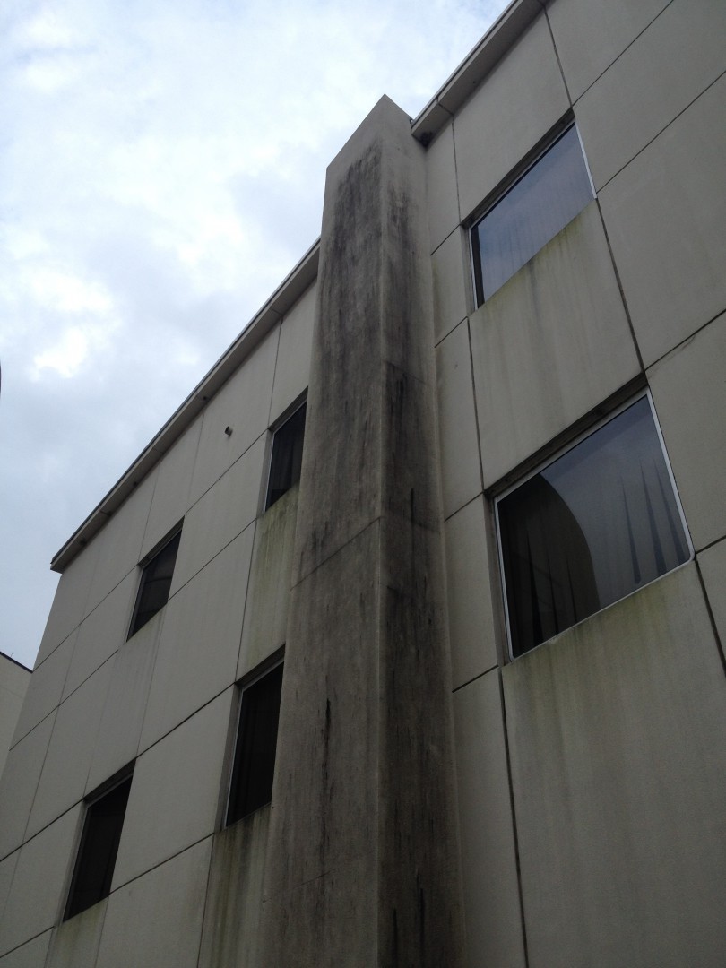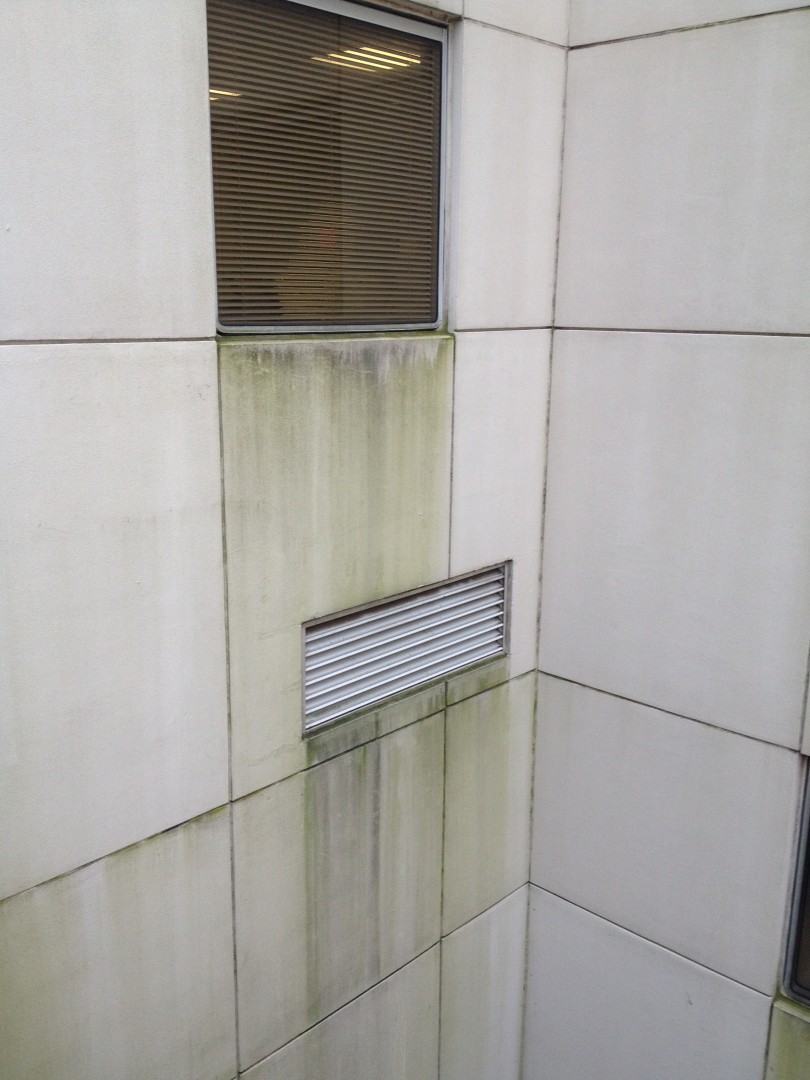 As my father always said "there's always more than one way to skin a cat". This was a prime example of finding another way to skin that cat. Since using a lift was out due to the reconfiguration and obstacles, we climbed to the top of the building, Took the orifice off of our cradle skid spray hose, and just let the solution run down the building. It also took $1200 worth of lift cost ( per day on a 120 footer) and reduced it to a four hour rental of a 35 foot lift for $200.