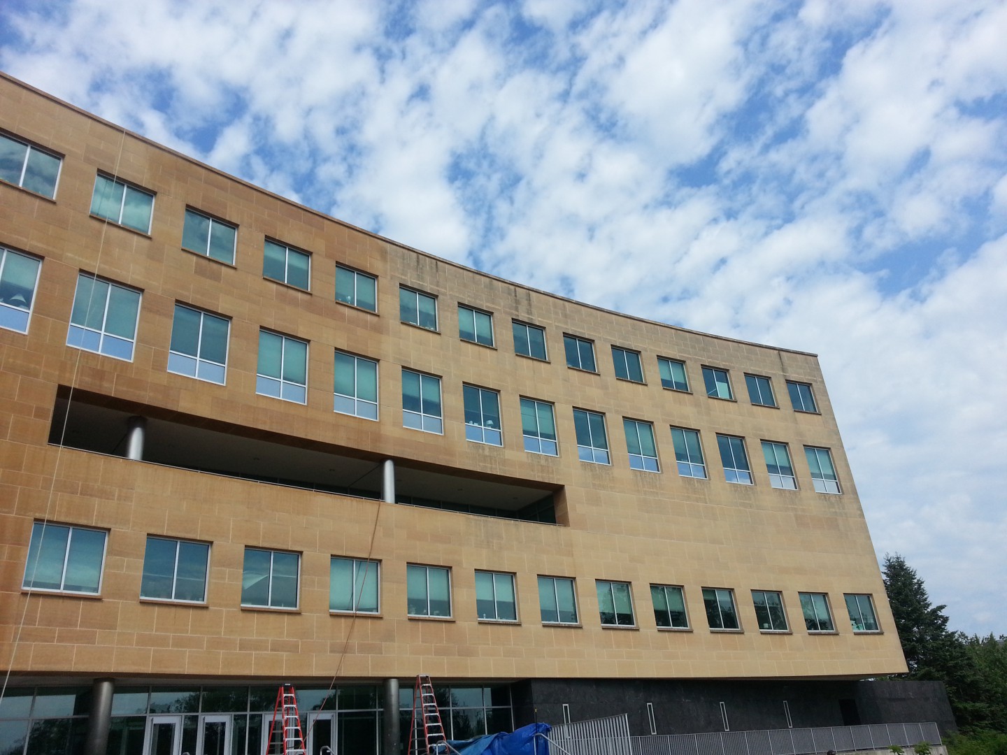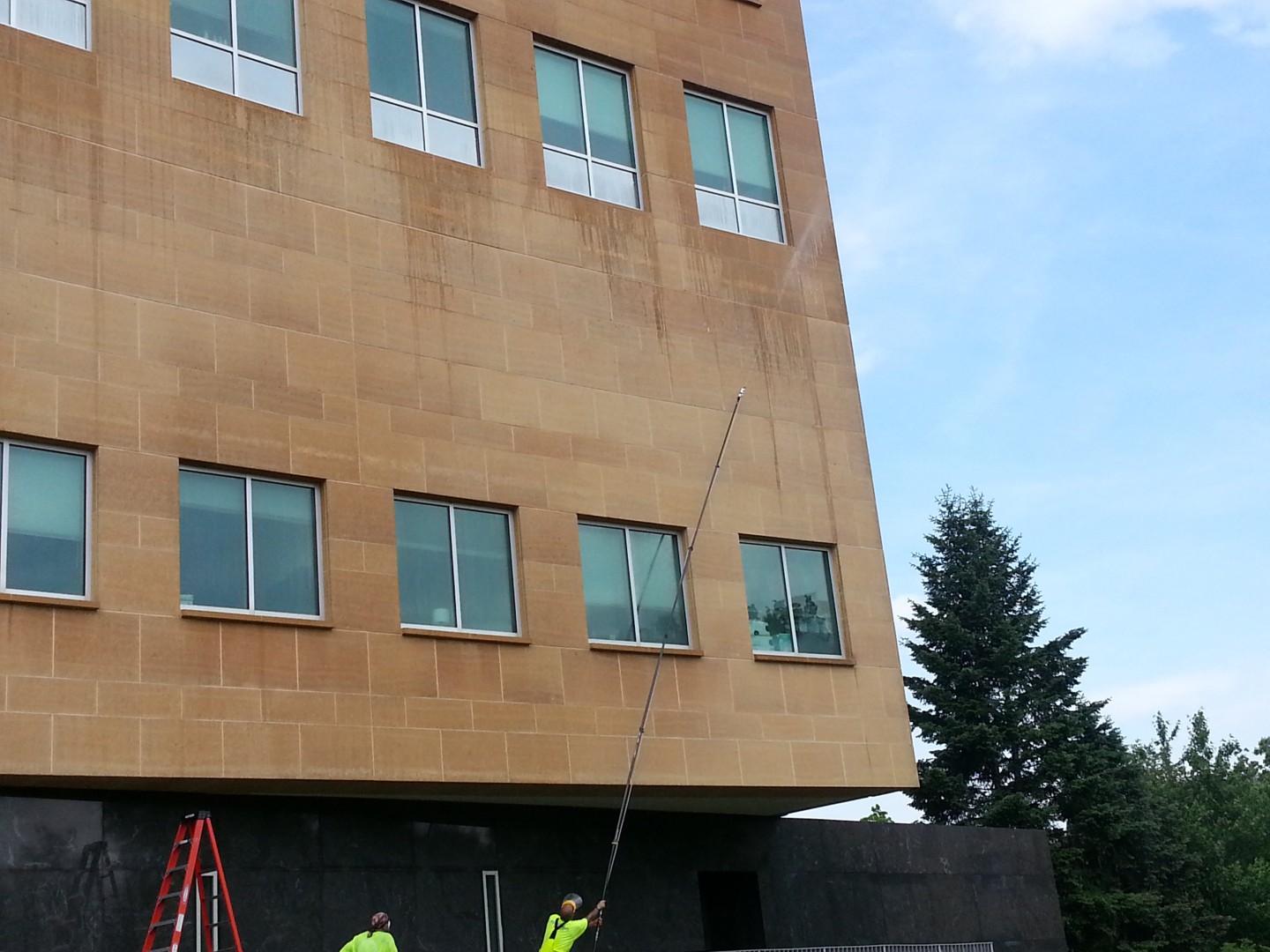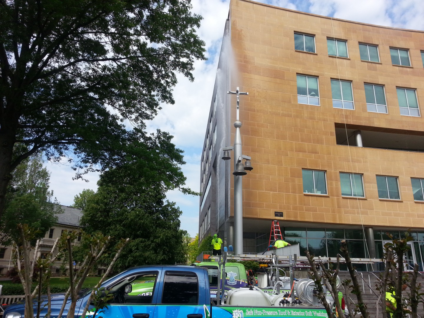 The Roof Wizard was contracted to clean the front side of Jubilee Hall at Seton Hall University. The building is a main focal point in the large wheel spoke courtyard and is seen from all angles of the main campus courtyard. It stands a total of 7 stories high, with two floors partially underground, with half exposure. The material was mostly sandstone based panel, with some natural granite panels also. One of the major logistic hurdles was that the use of a lift was not permitted. Also, the school had other bids for pressure washing, that were going to take 3-4 days to complete. The bulding is active and had people in and out all day, so the faster the better. Once The Roof Wizard explained that our process would take a day or less, it pretty much sealed the deal. We were on site thismorning at 8:00 AM and were pulling out at 1:00 PM. Five hours total and they were so impressed, we signed a contract for the Library as well, which is three times the size.