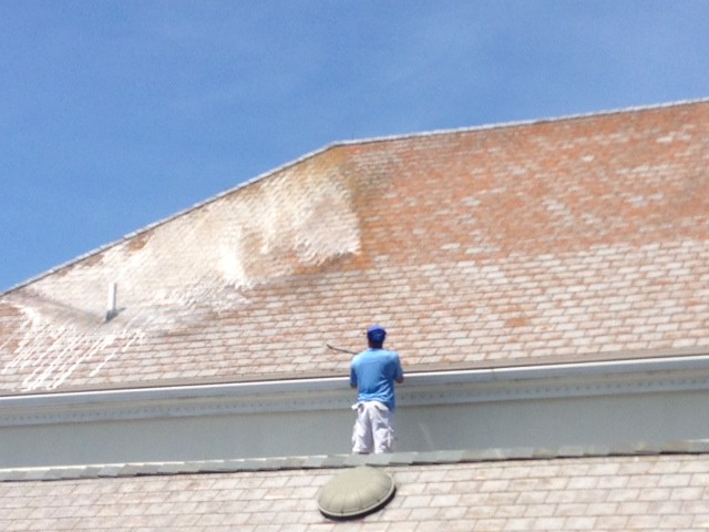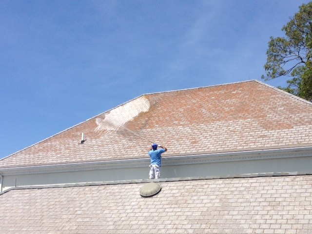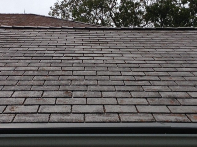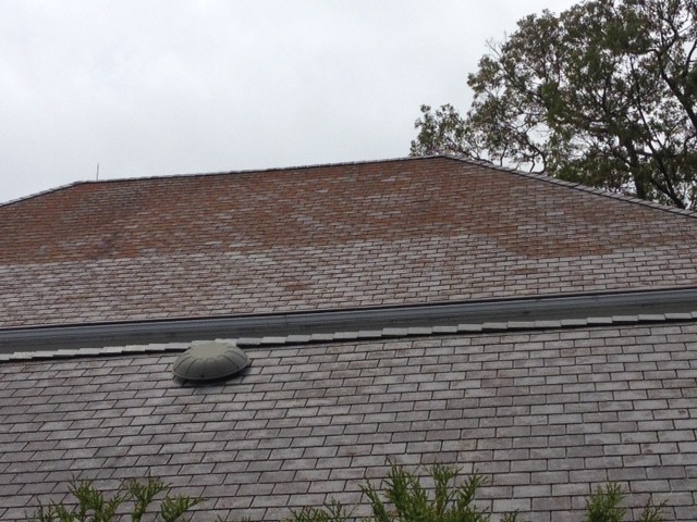 If it isnt slate it is a faux slate. The red color on the upper section is that algae or is it iron oxide seeping from those slate shingles. I wonder because it looks like the red is limited to that batch only which would mean it may be real slate. All natural slate contains iron. Some more than others and it is not uncommon for a batching effect to happen where these 100 square feet of slate has iron on it and the next 100 square feet doesn't, even on the same roof.