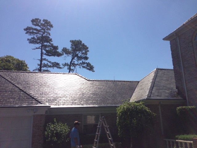 Is it slate? It looks like a concrete tile. Slate usually has variety of colors. Just use more GW or roof snot to improve cling, and test a small area.