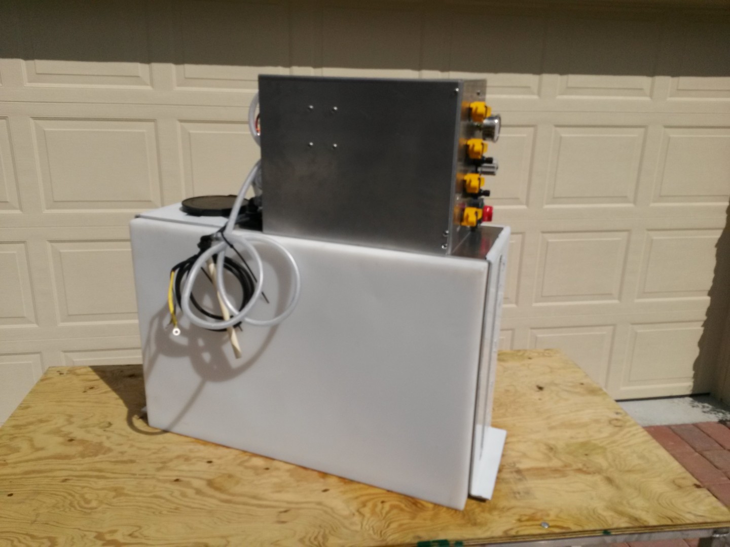 1. Universal to curbside right applications (US) and curbside left applications (world). 2. Square 50 gallon poly tank. 3. Graduated Tank Strap. (patent pending) 4. Module head / control panel features SoftWash Systems Direct Positive Injection (DPI) Technology. (patent pending) 5. Draw / Send Valves for attached tank and one additional linked tank. 6. Blend / Agitation for attached tank and one additional linked tank. 7. Because of the new modular format it is easy to add additional SoftWash Systems Mixing Tank Modules to a new Generation III Cradle Skid for double softwashing applications.