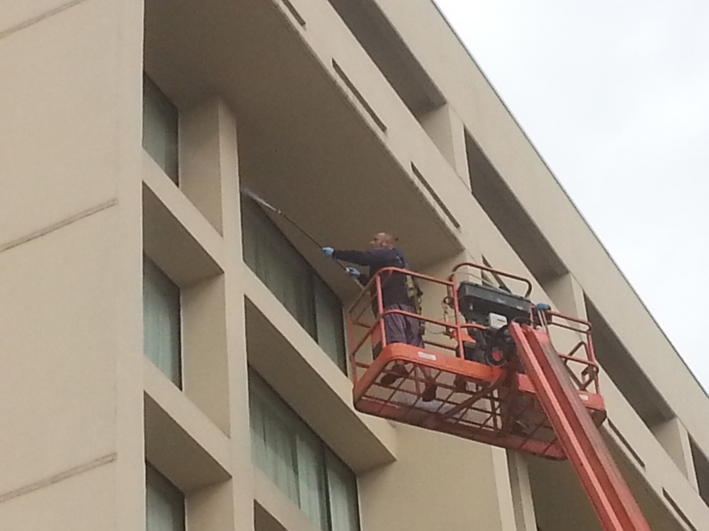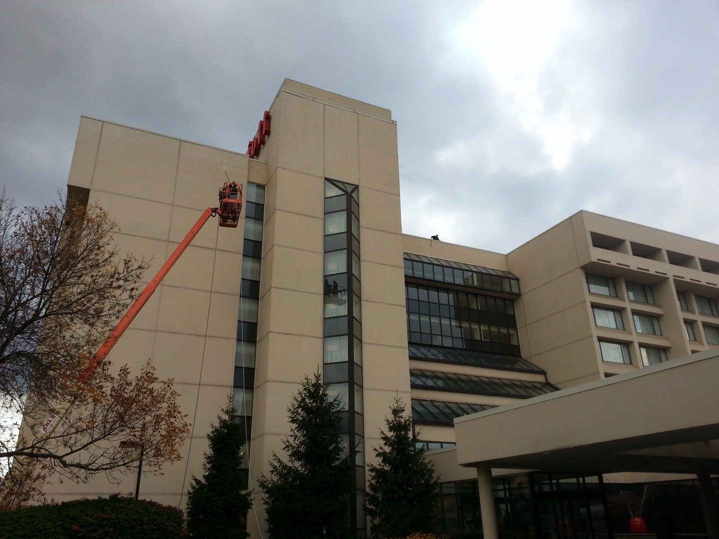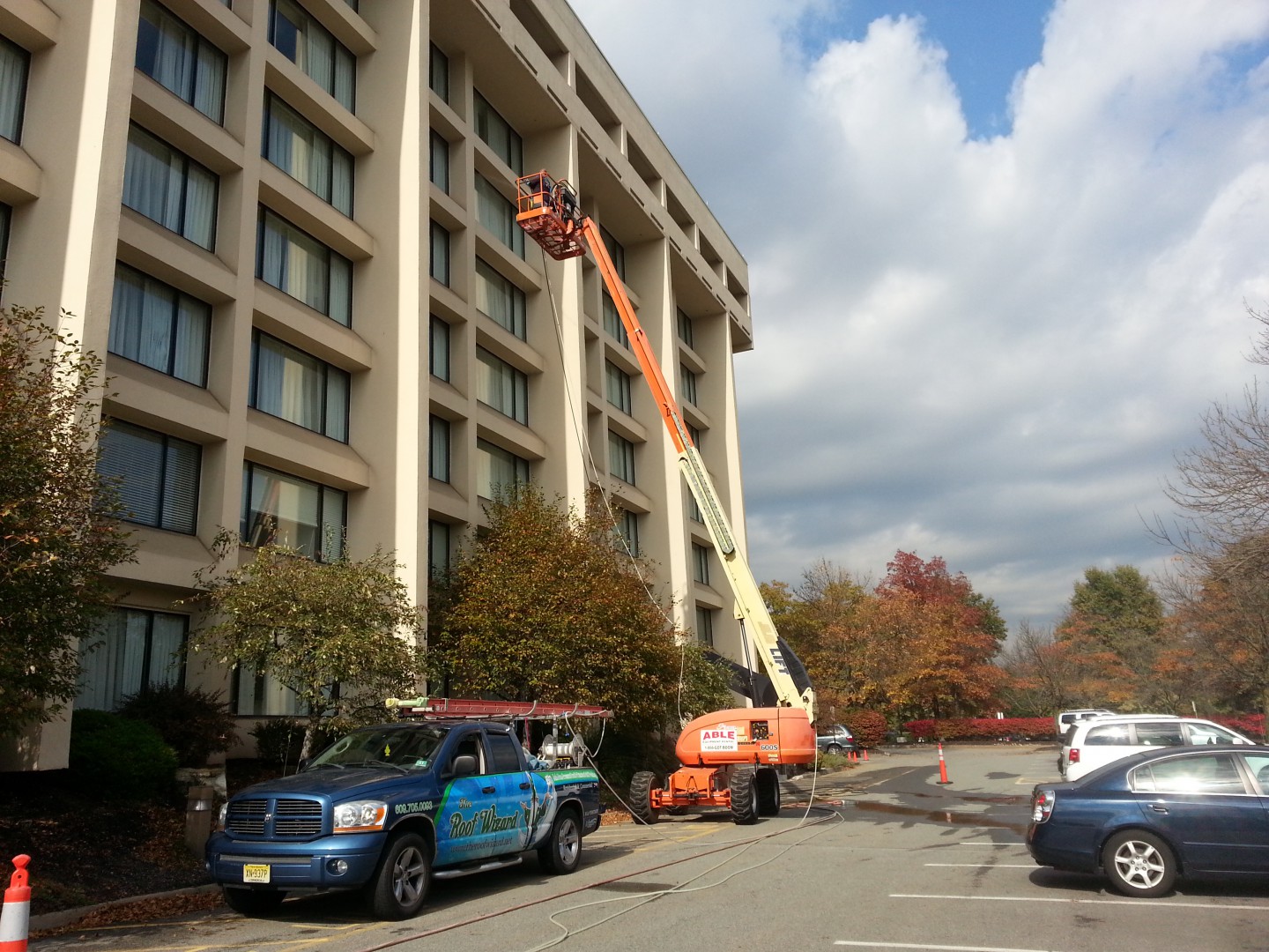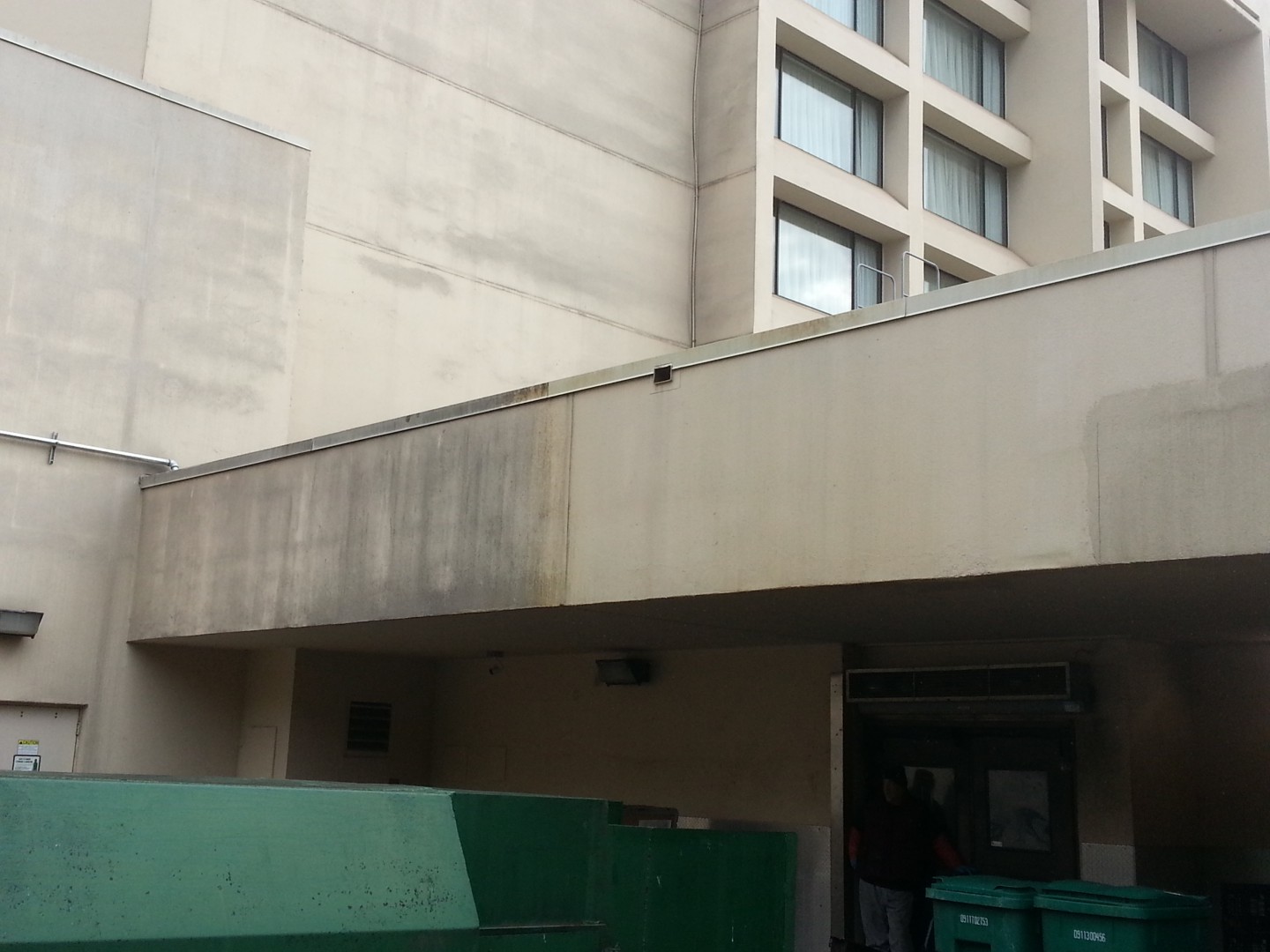The Roof Wizard was contracted to clean this Marriot in Hanover/Whippany, NJ, this past week. The project was a challenge with the hotel being extremely busy and booked out solid every day. The building ranges from 8-11 stories and only a lift could be used on one and half sides. All the other sides are surrounded by the 20,000/SF conference center, which also was booked solid. The 78 balconies were a task in themselves. We softwashed the entire building Monday, Tuesday & Wednesday which put us a day ahead of schedule. The hardest part was dealing with the extreme wind, rain and 48 degree weather on Wednesday. The surface was a Siloxane coated EFIS, which was infested on two sides pretty bad. The hotel management had two other quotes from local pressure washers, who said the project would take a minimum of six days, and they could not assure them that the coating would not be damaged.