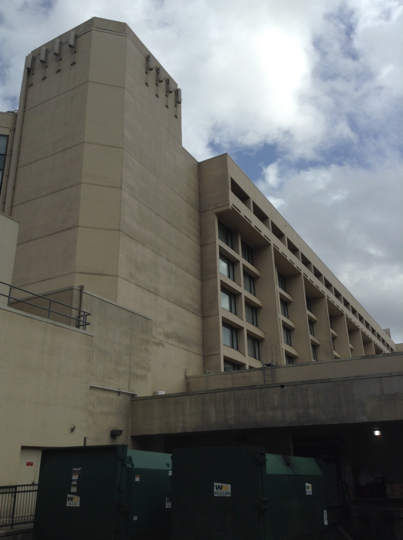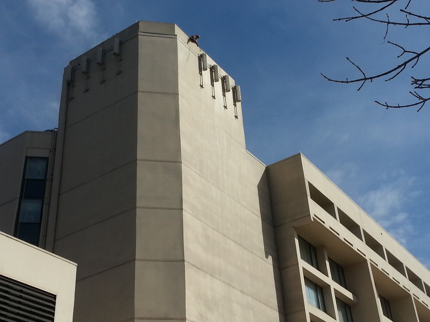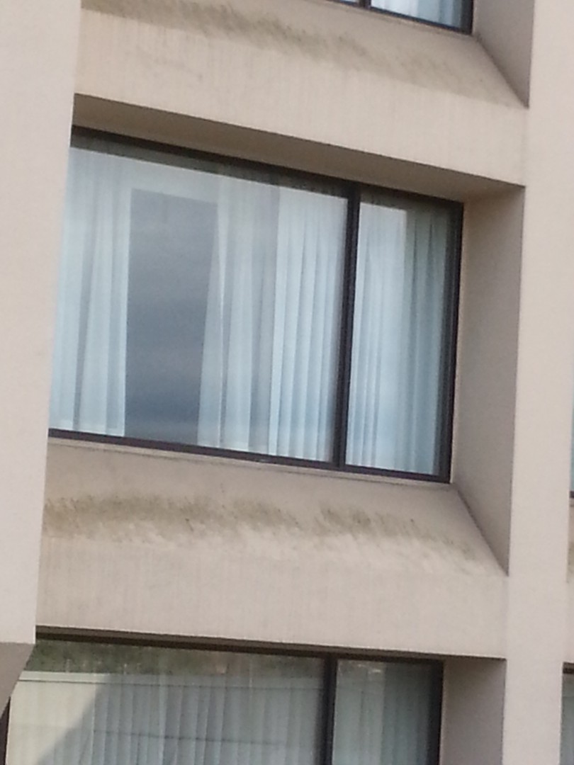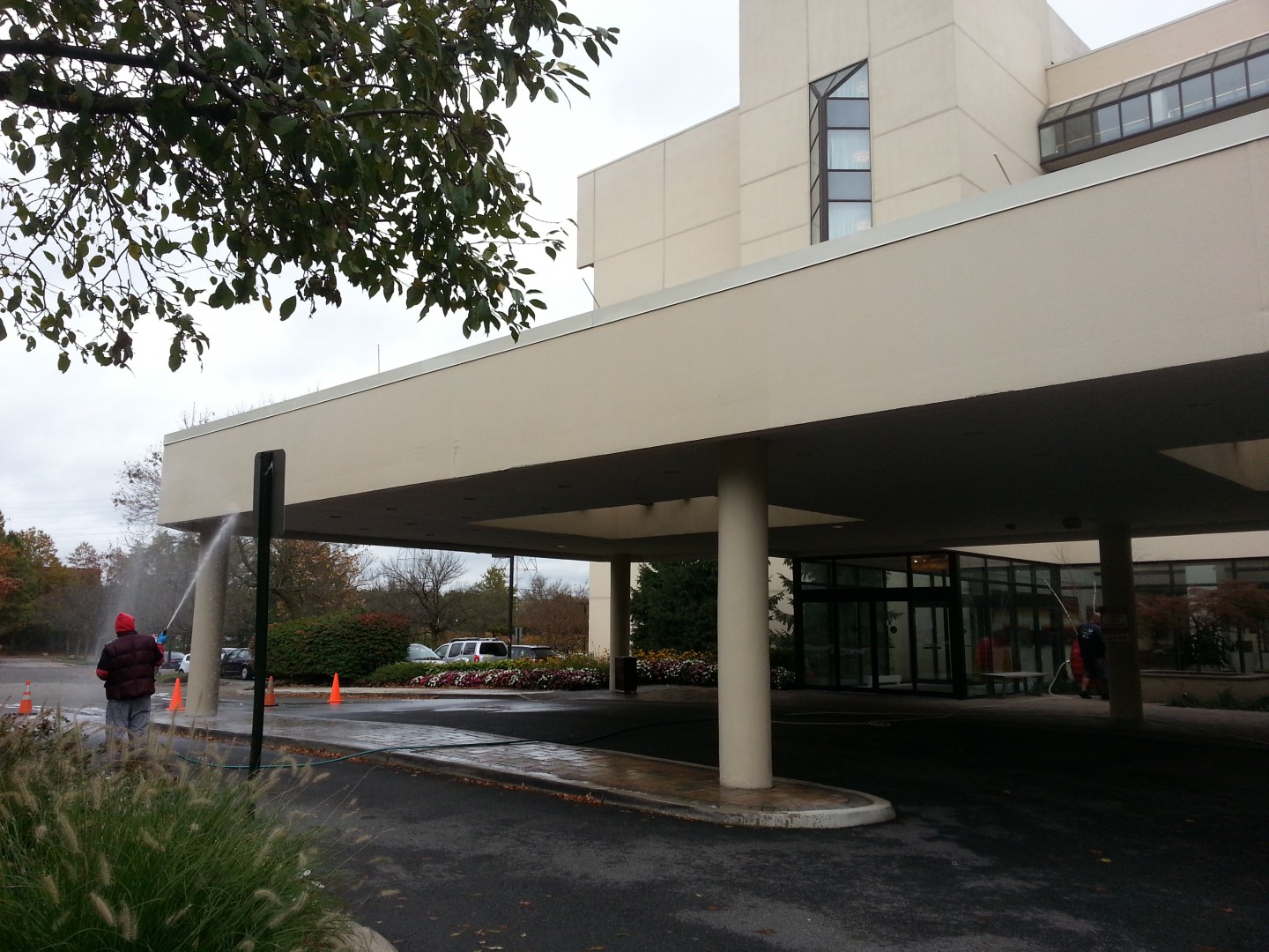 The Roof Wizard was contracted to clean this Marriot in Hanover/Whippany, NJ, this past week. The project was a challenge with the hotel being extremely busy and booked out solid every day. The building ranges from 8-11 stories and only a lift could be used on one and half sides. All the other sides are surrounded by the 20,000/SF conference center, which also was booked solid. The 78 balconies were a task in themselves. We softwashed the entire building Monday, Tuesday & Wednesday which put us a day ahead of schedule. The hardest part was dealing with the extreme wind, rain and 48 degree weather on Wednesday. The surface was a Siloxane coated EFIS, which was infested on two sides pretty bad. The hotel management had two other quotes from local pressure washers, who said the project would take a minimum of six days, and they could not assure them that the coating would not be damaged.