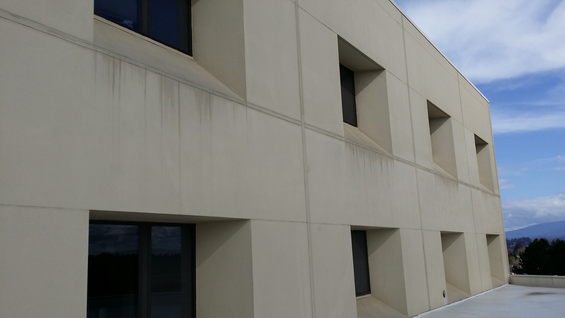 Mt Hood Legacy in Gresham, Oregon approached us with a desire to get the building SoftWashed. They had used pressure washers in the past and were concerned with the seams on their elastomeric coating being blasted (which had happened in the past), as well as the lack-luster results. The director of maintenance said that the streaks under the windows were barely lightened when pressure washers blasted at it with 4000 PSI.