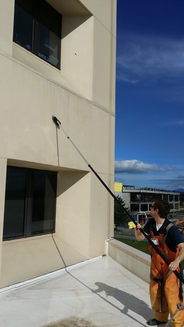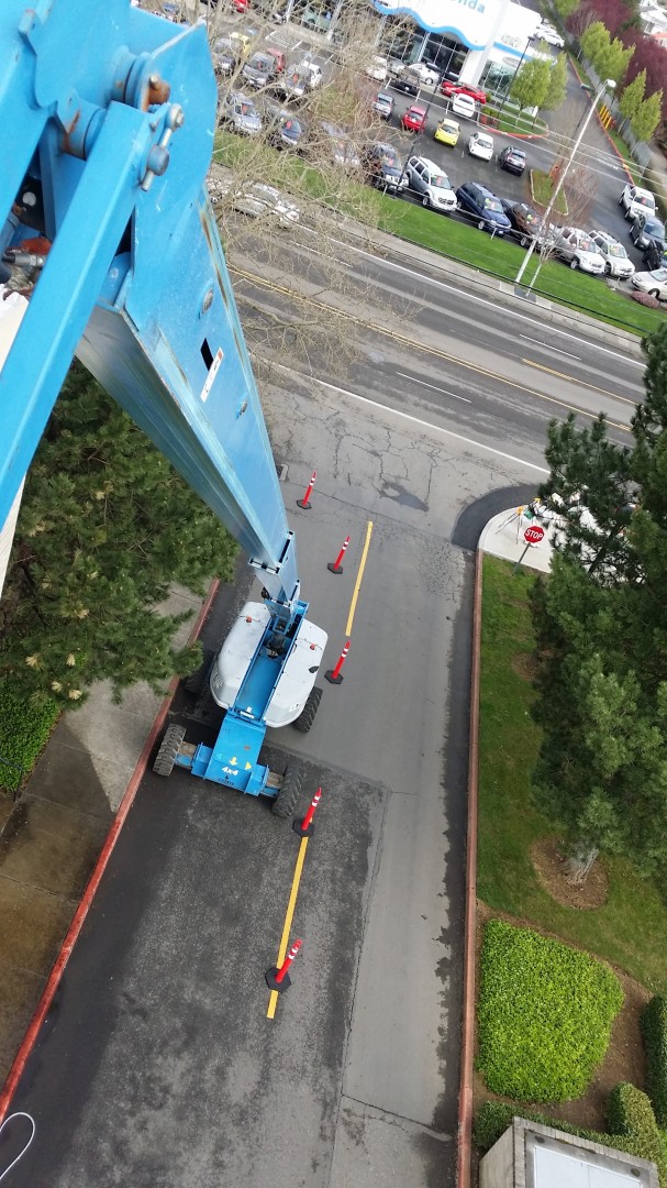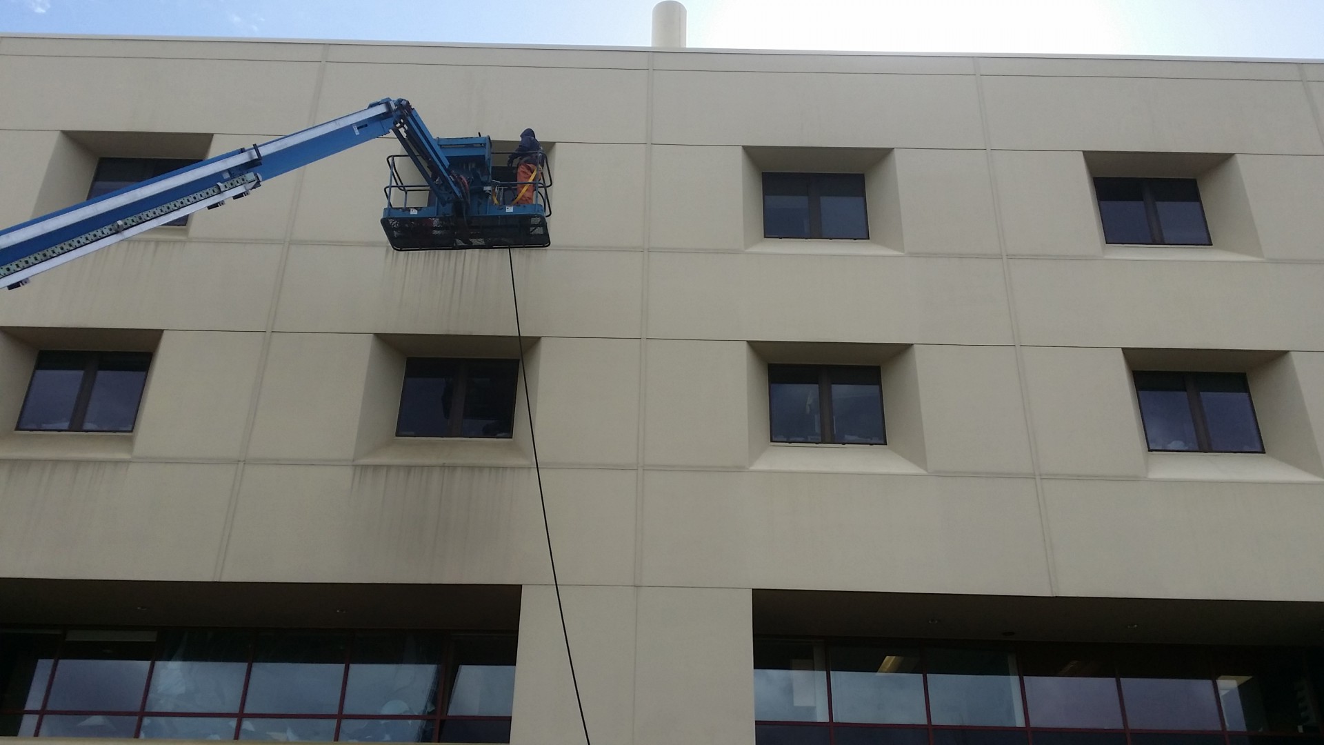 Since the stain removal process involved scrubbing with soft bristle brushes, an 85' boom lift was needed to reach the front areas of the hospital effectively. All of our technicians wear OSHA and ANSI approved safety harnesses and are certified boom lift operators - safety is a company culture!