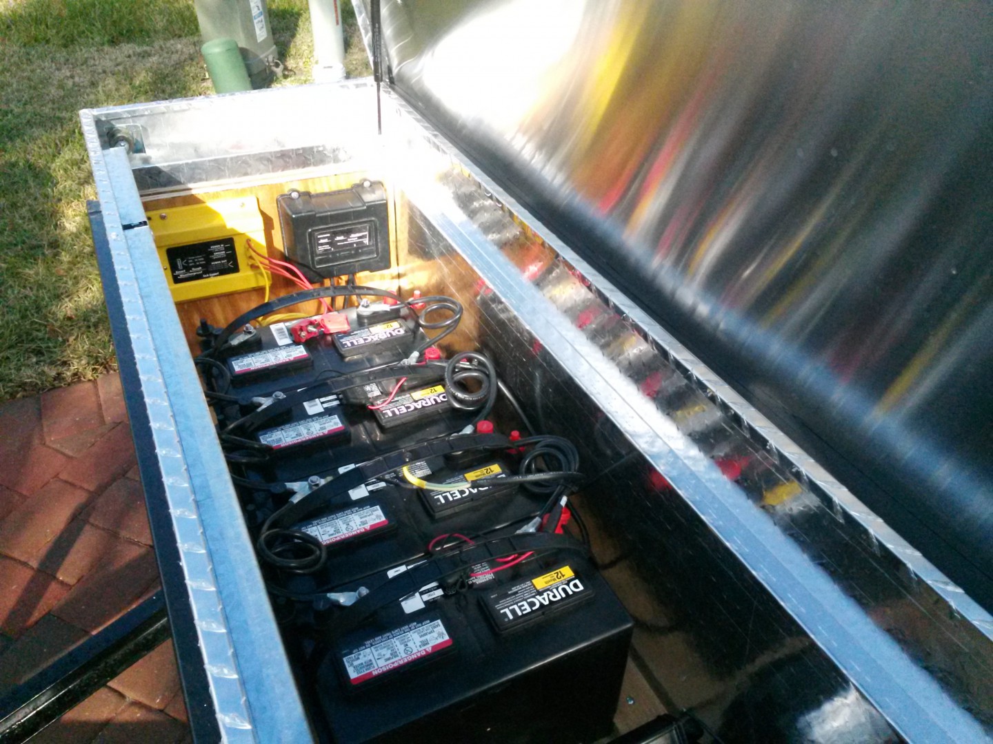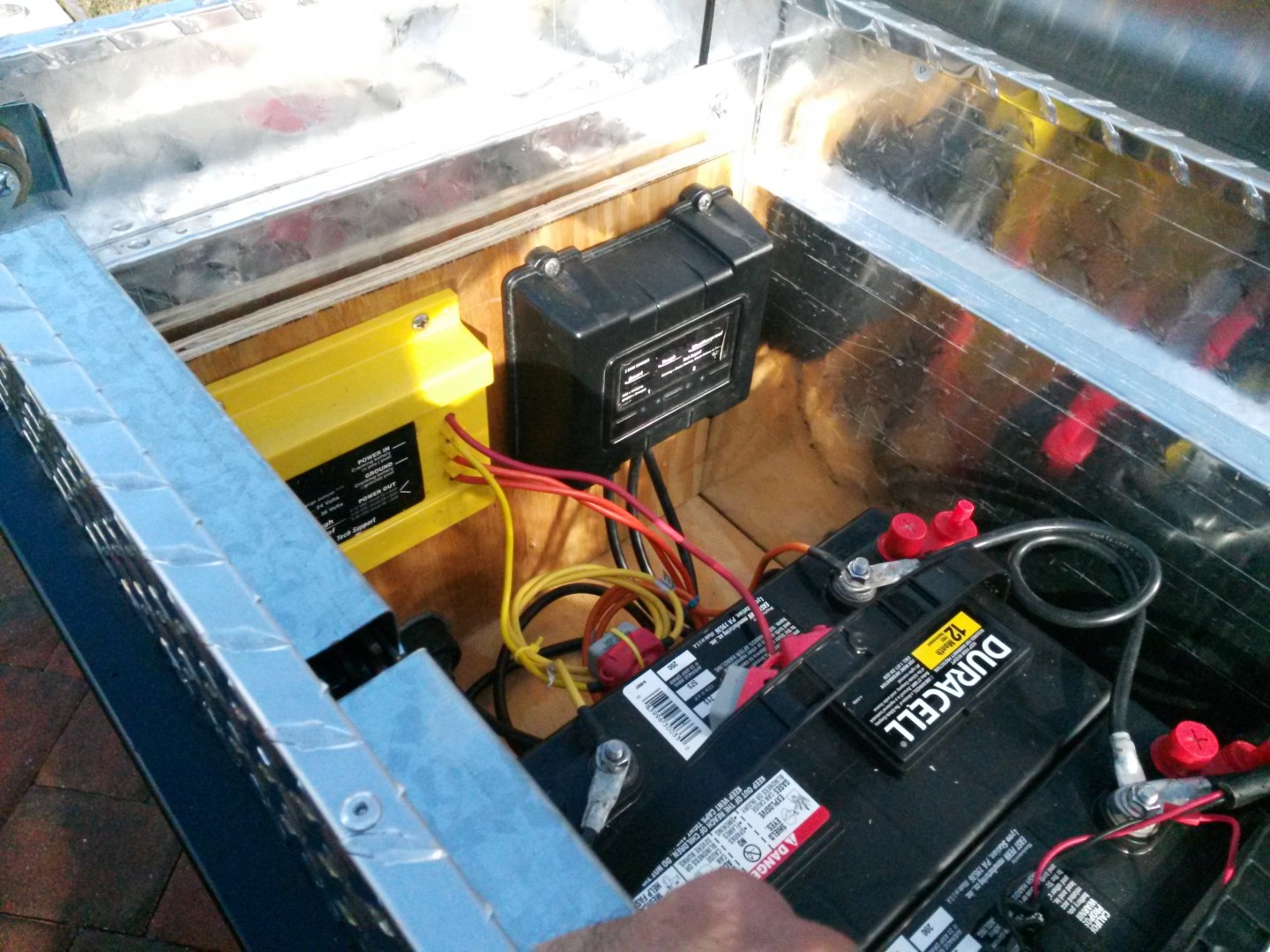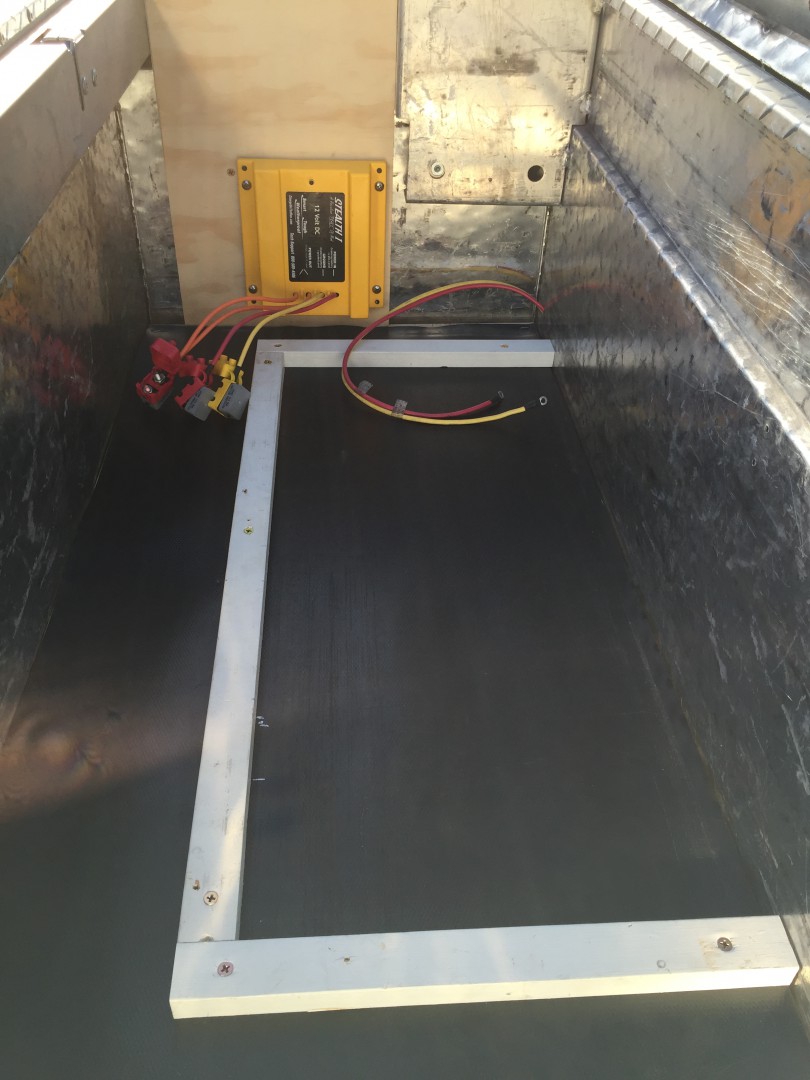 1) I cut two pieces of 3/4" plywood and attached them to the toolbox to mount the systems to. One for the battery back and AC inverter, one for the Stealth DC charger which needs to be mounted on a vertical surface for venting/cooling.
