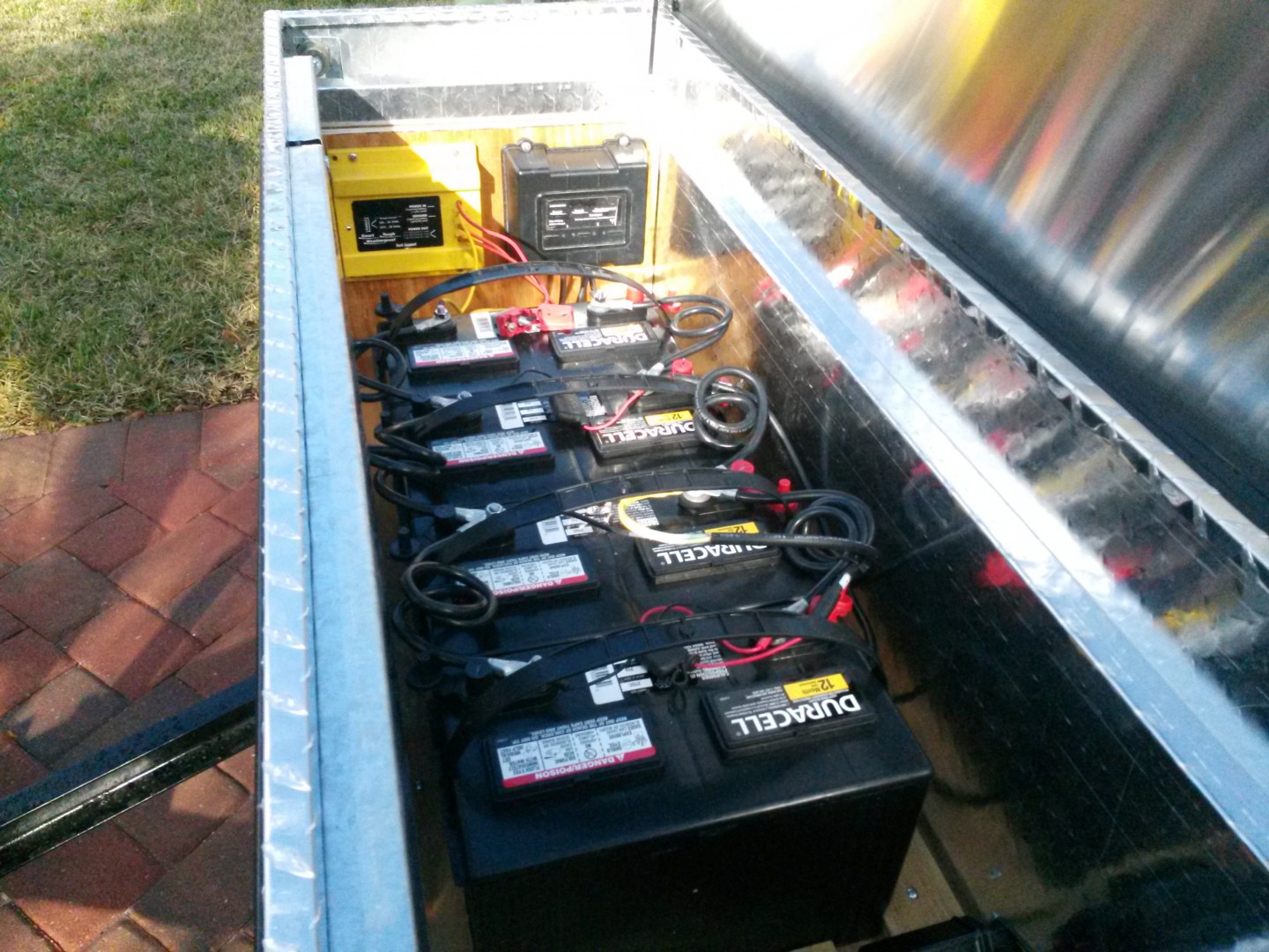 4) Inspired by the pictures AC put up of that other battery bank install I made a wood strip retaining ring around the batteries to keep them from shifting around. I only have 3 batteries at this point but I made space for 4 so I can add another soon.