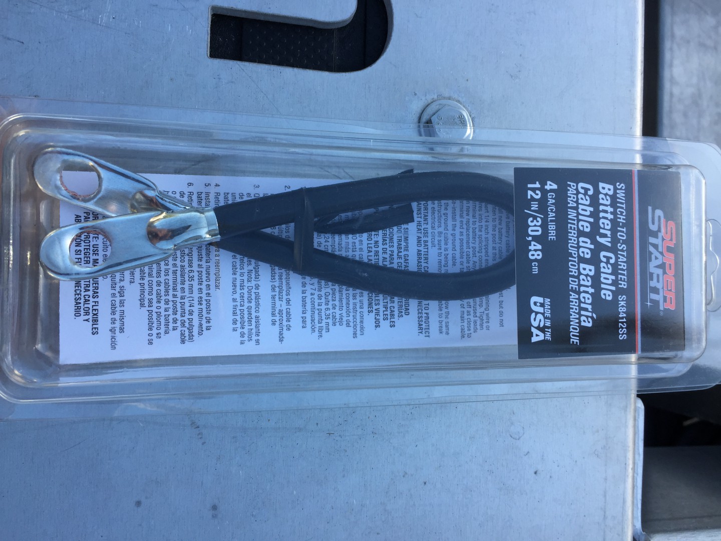 5) I bought some 12" 4 gauge battery cables to link the batteries together. Non of the auto parts stores around me carried more than one in stock, so I had to have them ordered in. So maybe call ahead to have them order some in for you. For a bank of four (4) batteries you'll need six (6) of these cables. *You want to connect the batteries in parallel, so make sure you're connecting positive to positive and negative to negative (see pictures). The way I understand it, when you connect in parallel you get the same voltage (12 volt) as you would with one battery, but as you add more batteries you increase the available amp hours, so you can power everything for a longer amount of time. If you were to connect the batteries in sequence (connecting pos to neg, neg to pos, etc.), you would have the same amp hours as one battery, but the voltage is multiplied (1 battery = 12 volts, 2 = 24 volts, 3 = 36 volts....).