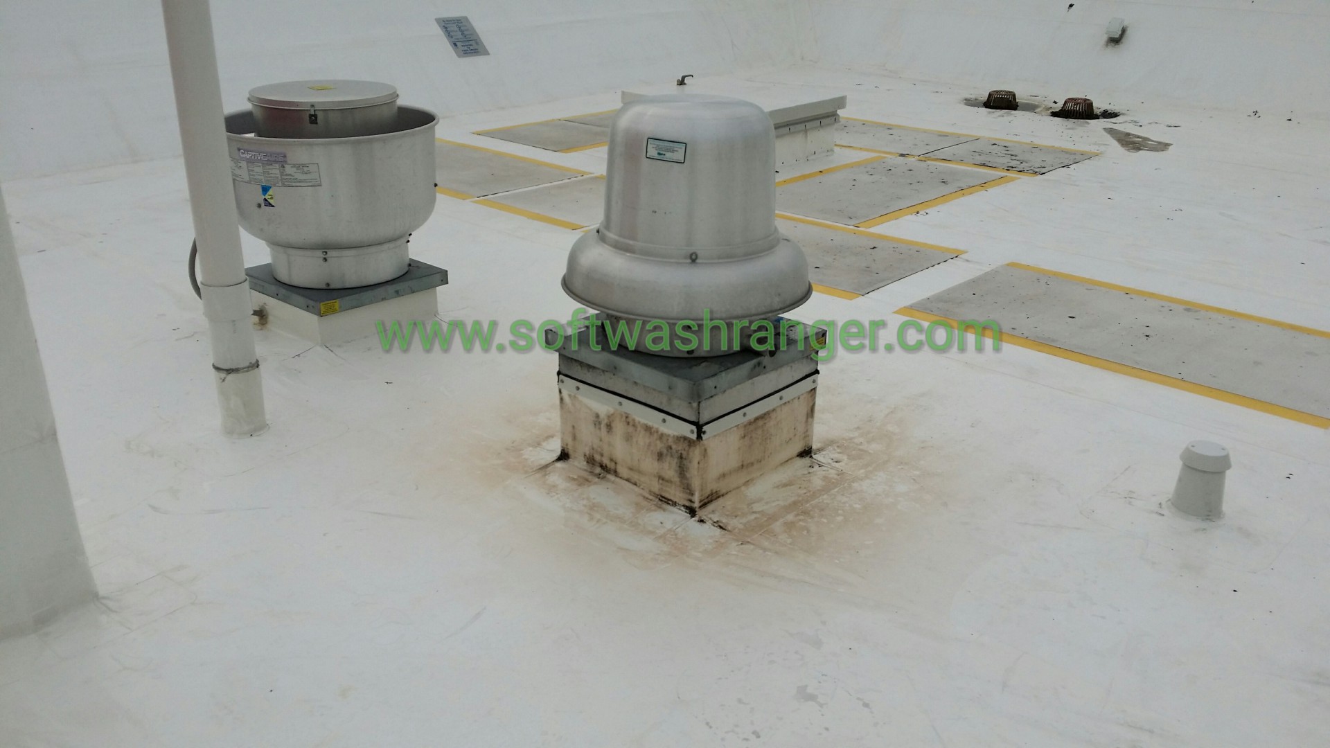 Softwash Ranger was contracted to clean the roof of a well known chain restaurant. The roof was a Duro last membrane roof. The roof was dirty and greasy from the environment and mostly from the grease from the kitchen duct work. The company that cleans the ducts and grease traps cleans them on the roof but does not clean up after themselves. They have left a couple of years worth of grease on the roof membrane. We saw this as an opportunity to show the power of softwashing . We used a 2 percent mix with plenty of green wash and Terra wash in it And some elbow grease. We were able to give them a clean roof and we are looking forward to doing more work for them.