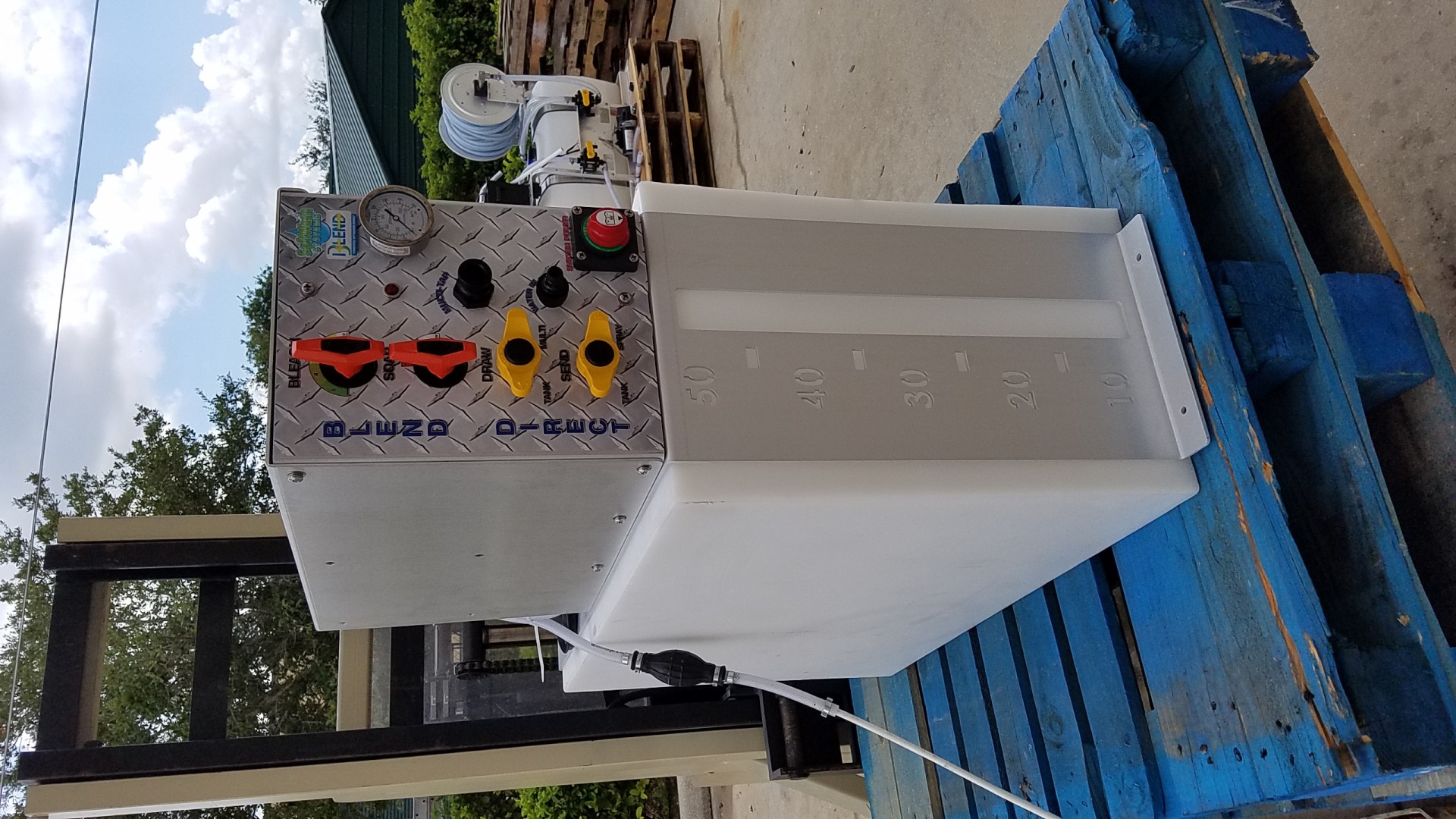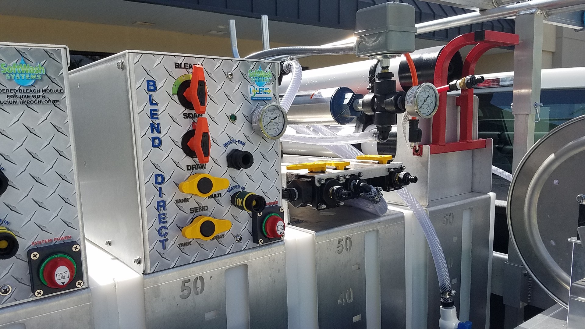 This appears to be an upgrade to a similar system I've seen elsewhere and from I know of it and AC's equipment, the Blend 50 and Blend 100 have three inputs. One for bleach (SH or pulling from a CH module, adjustable from 0 to 5%), the soap/surfactant input, and the water input. From what I see it appears the water input would be a water hose connected to the customers water spigot, or a connection from the bulk rinse tank possibly if the customer is on a low performance well. The Blend 50 would have a 50 gallons SH storage tank, and the Blend 100 would have a 100 gallons of bleach storage.