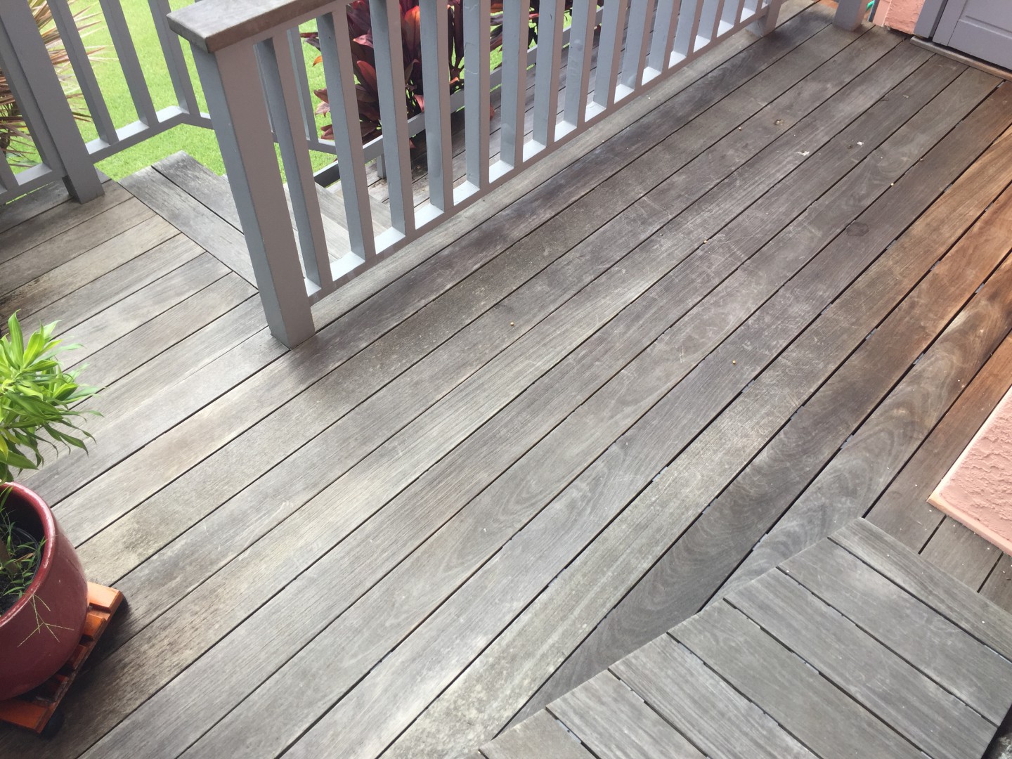 looks like ipe or similar hard surface deck. 1/2% to 1% wood wash. You may have to scrub with deck brush. Rinse well and then Wood Restore. We did one where homeowner had sealed and it was a pain. In future demo a section with a pump sprayer so homeowner can see results.