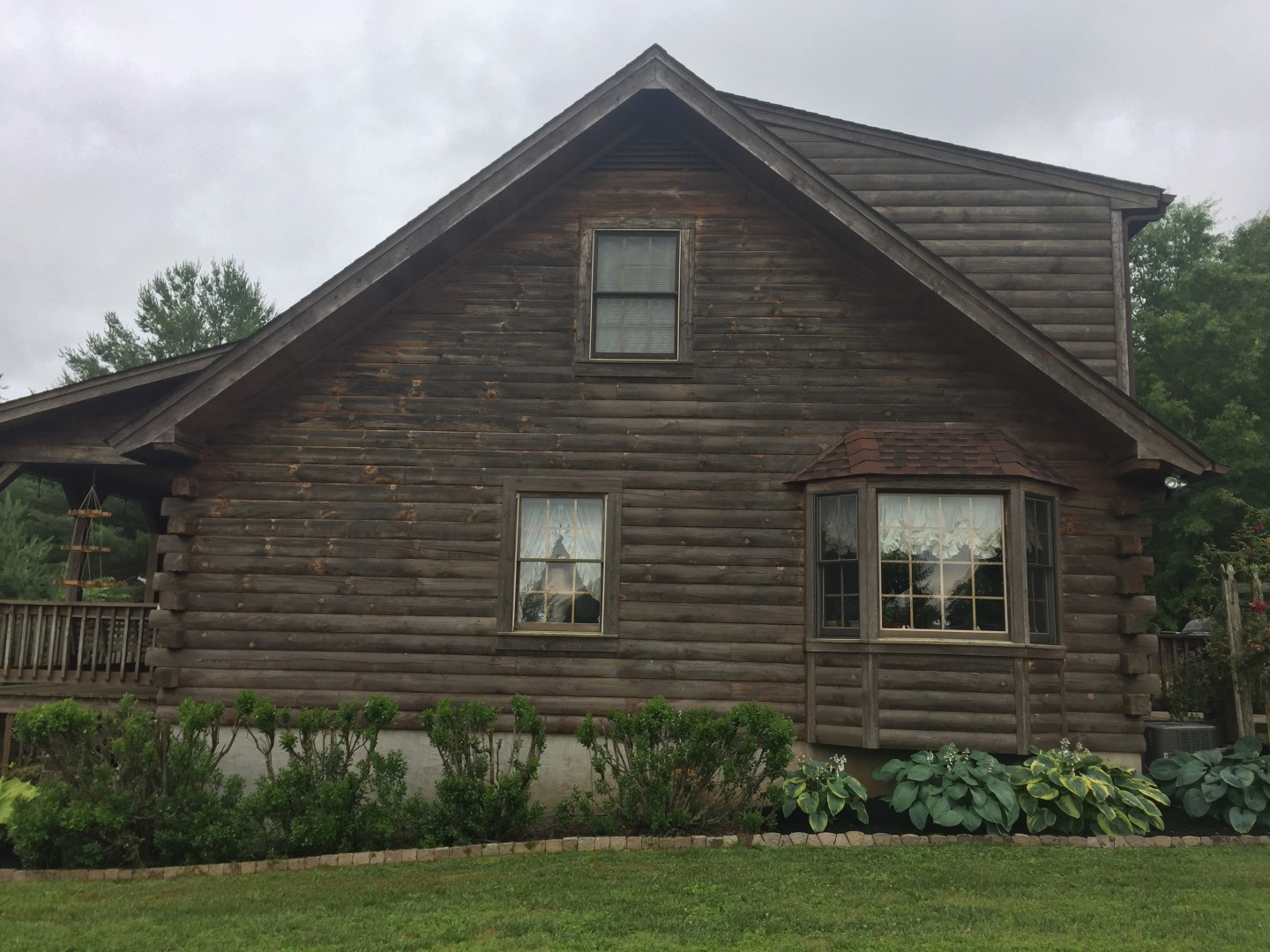 Here are the before and after pictures of the log cabin project. We struggled with rural water supply - both volume and pressure. Not enough pressure for the garden hose nozzle to reach upper levels and not enough of either to use the pressure washer to rinse. The pressure washer kept running away from water. Finally got it rinsed though and applied Wood Restore (and of course rinsed off the window glass after applying Wood Restore).