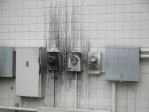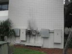 Funny you should mention this idea. My worst screw up happened just yesterday, June 25, 2011. I was softwashing this building, aiming at the top of the second floor. I had just begun on this wall. Suddenly I heard a BOOM right in front of me and was hurled to the ground.  Somehow water had gotten into the meter and caused a short. It literally exploded into a ball of shrapnel, fire and electricity.  If I had been a few feet closer to the box, or spraying chemical directly on to it, I would have either died or been seriously injured.