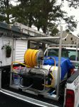 Here is my new skid I took delivery of yesterday from Paul Kassander at www.powerwashstore.com. A 3000PSI 8GPM Hydro tek Cold water pressure washer w 150 foot hose and pivoting reel, 150 Garde hose on titan reel, Dual Roof Pump system w Titan Reel and 300 Feet of Poly Braid hose, 2 55 gallon tanks, 1 100 gallon tank for pressure washer, 24 inch Ground Force Collapsible Surface Cleaner. All mounted on a skid that can slide in an out of my truck bed. Used it today and loved it. NO MORE TRAILER.....except for those really big jobs.
