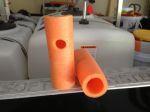 I use a hollow pool noodle cut to about 10 inches. Fits great and can't be missed and dirt cheap. I've also cut a 1" hole towards one end so if I want to allow water to flow I can adjust. Like last week I was cleaning the roof for Larry Mize the masters winner. He had a indoor putting green with a screened in wall. I did not want anything overflowing the gutters to splash inside so the hole in the noodle allowed me to still flood the gutter and drain the diluted mix into the woods.