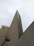 As my father always said "there's always more than one way to skin a cat". This was a prime example of finding another way to skin that cat. Since using a lift was out due to the reconfiguration and obstacles, we climbed to the top of the building, Took the orifice off of our cradle skid spray hose, and just let the solution run down the building. It also took $1200 worth of lift cost ( per day on a 120 footer) and reduced it to a four hour rental of a 35 foot lift for $200.